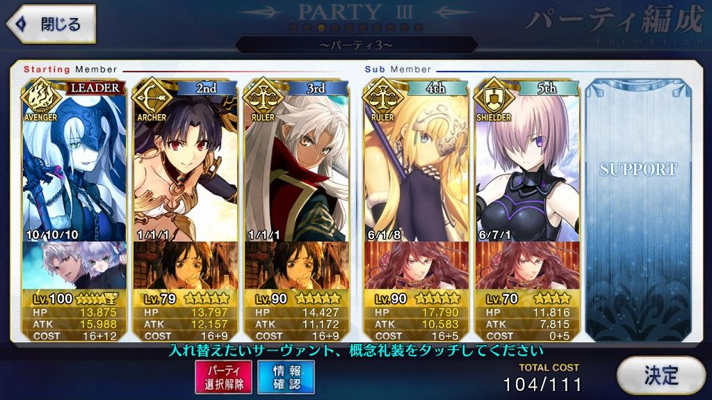 持ってなかったニトクリが出たのもラッキー。ストックしてた種火で出来るだけレベル上げて今回はこの編成で開始。
