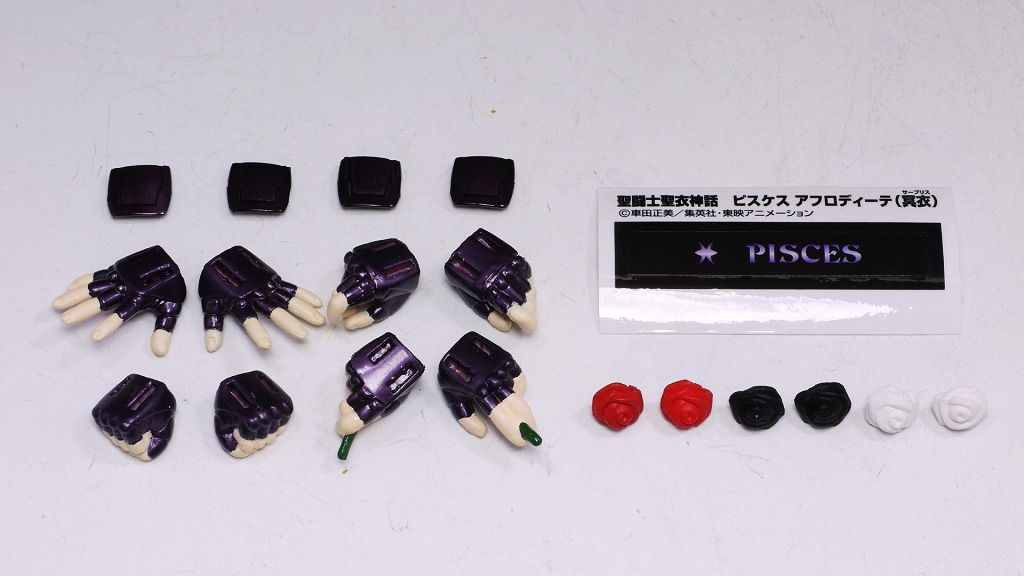 専用の薔薇持ち手首が付属し、赤、黒、白の薔薇を付け替えられるようになってます。
