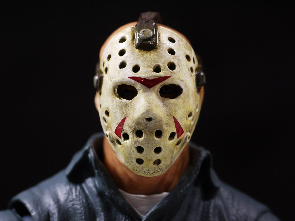 ホッケーマスクをつけた状態の顔。ほどよく汚し塗装になってて映画そのままな感じ。