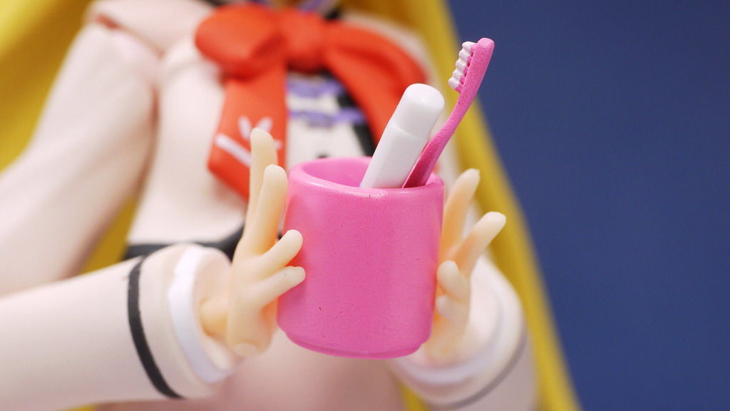 ピンクのマグカップ。歯ブラシと歯磨き粉も付属。こんな感じで両手で持つのが正しい持ち方みたいです。