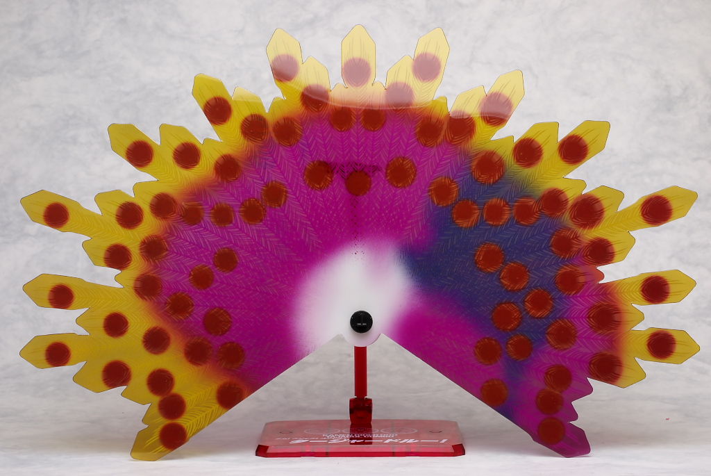 今回一番目立つオプションのクジャク羽。エナジーウイングなどと同じ薄い素材で独特なクジャク柄がプリントされてます。