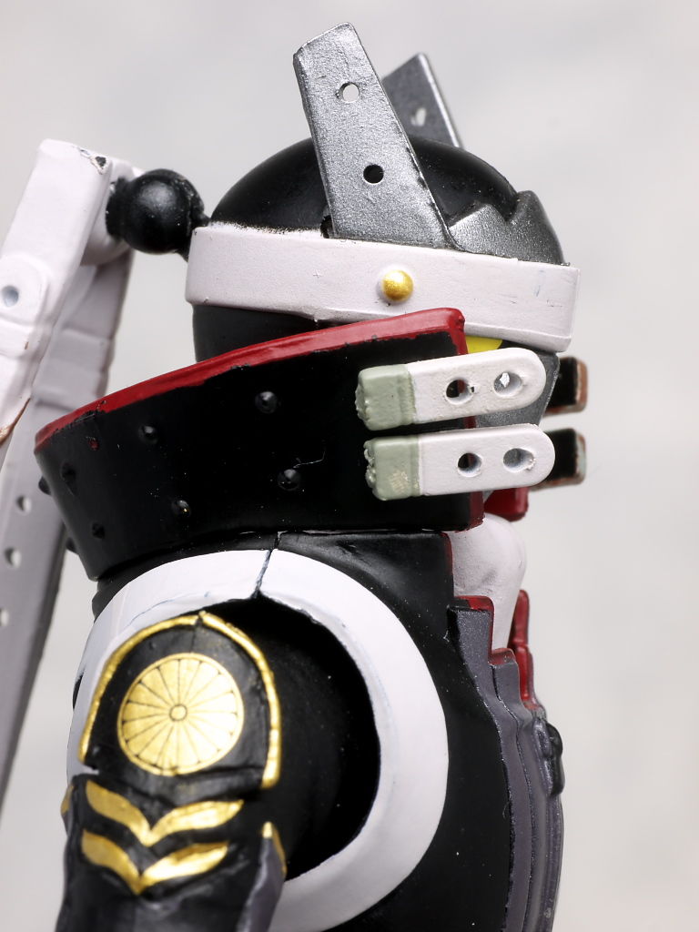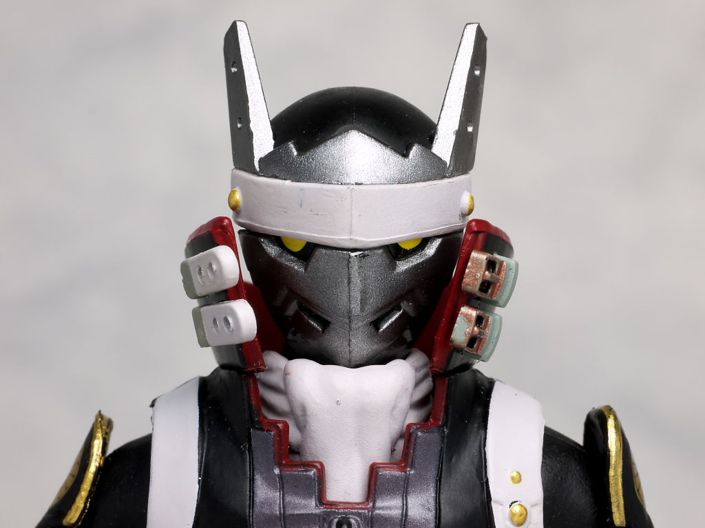 顔。仮面のような金属の質感も上手く再現されててアップだと多少粗はあるものの造形塗装ともによく出来てると思います。