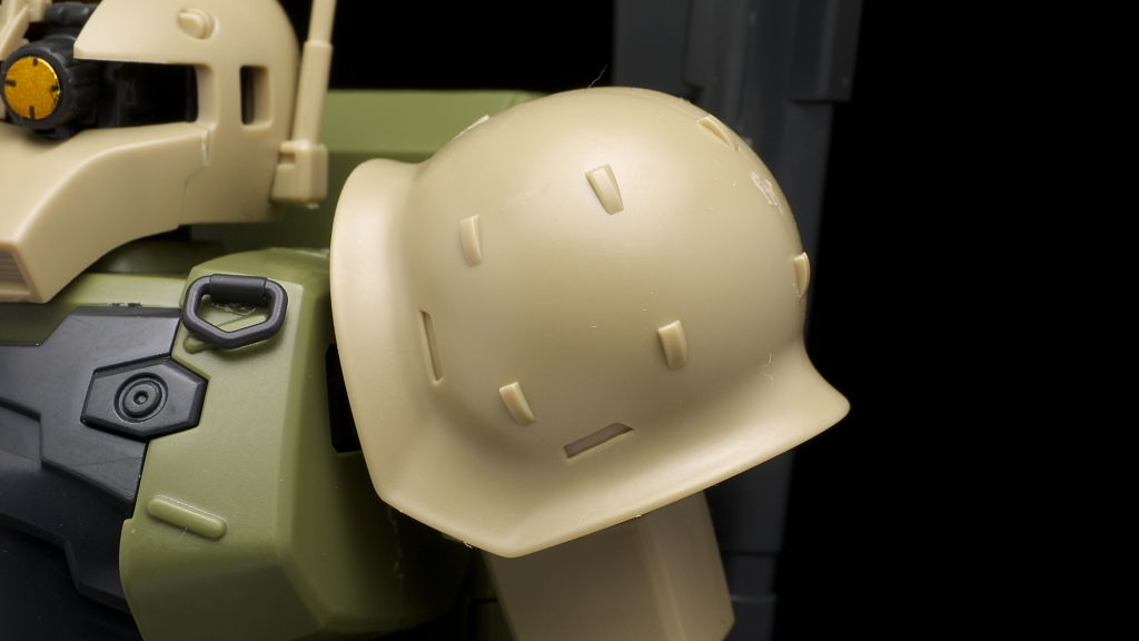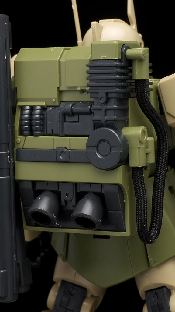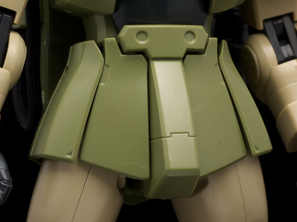腰回り。見本だと胴体やバックパックなど含めもっと茶色っぽいんですが成型色は薄い緑になってました。