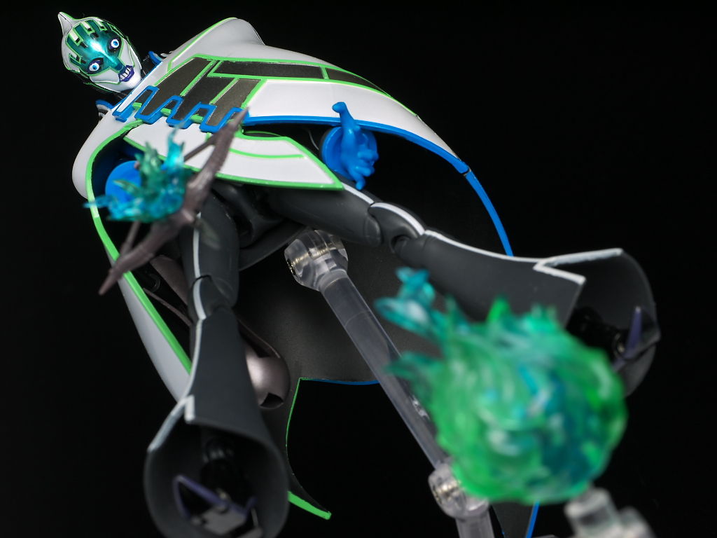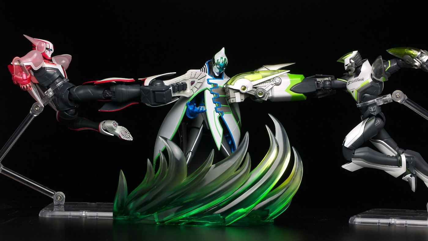 今回はマントの着脱が出来るというこれまでの物にはなかった特殊なギミックがありますが、両形態ともプロポーションなど違和感なく作られており、マントの前側パーツが2種付くあたりも気が利いてて良かったです。