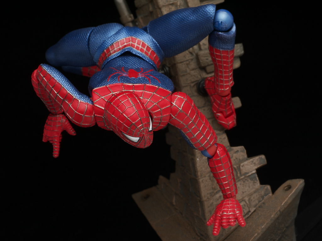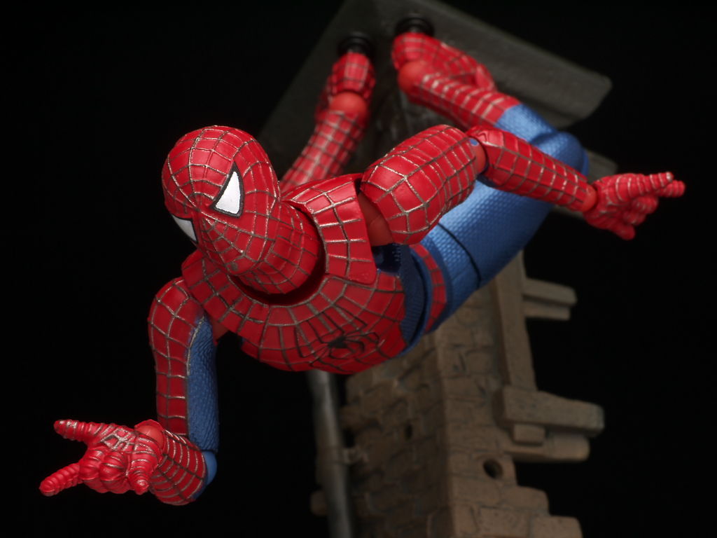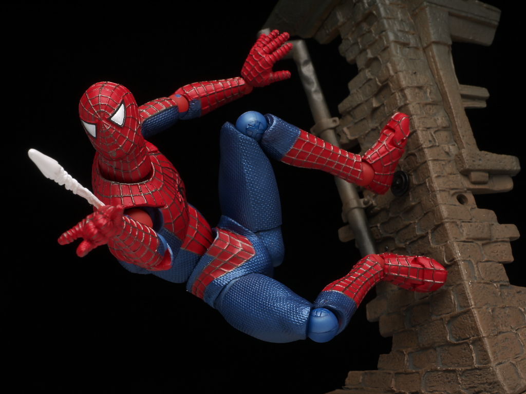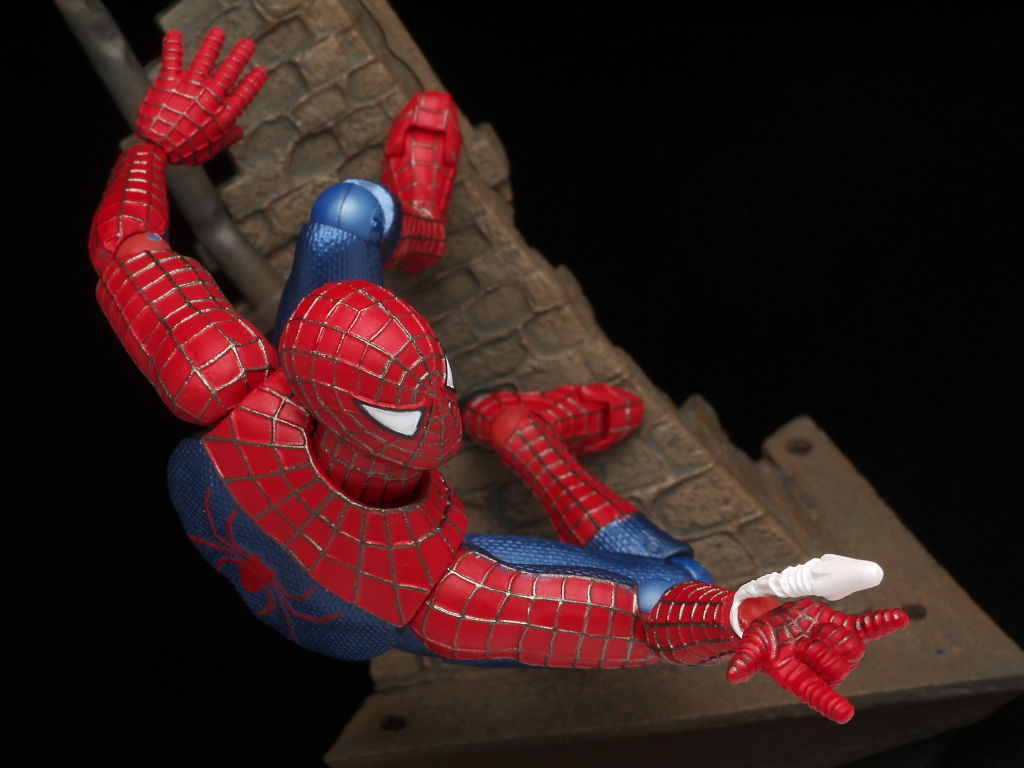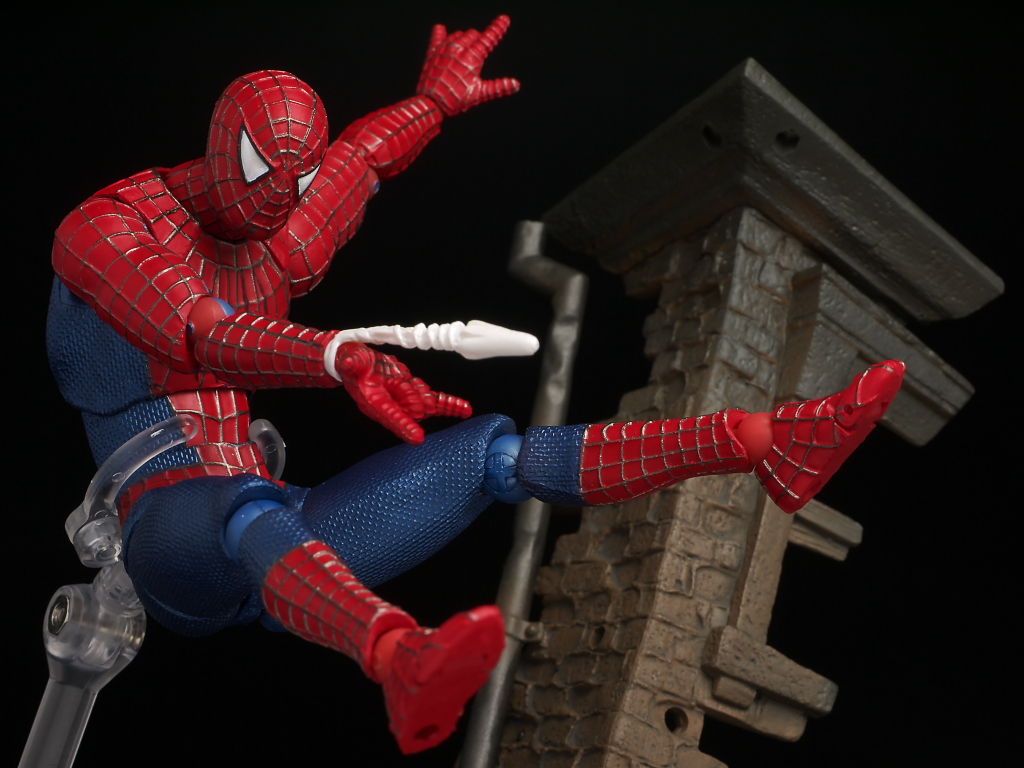 リボルテックにしては珍しく太腿ロールもあるおかげでスパイダーマン独特の足の開き方もバッチリ再現でき、使い勝手のいい飾り台もついてるので遊びの幅も非常に広い仕様になってました。