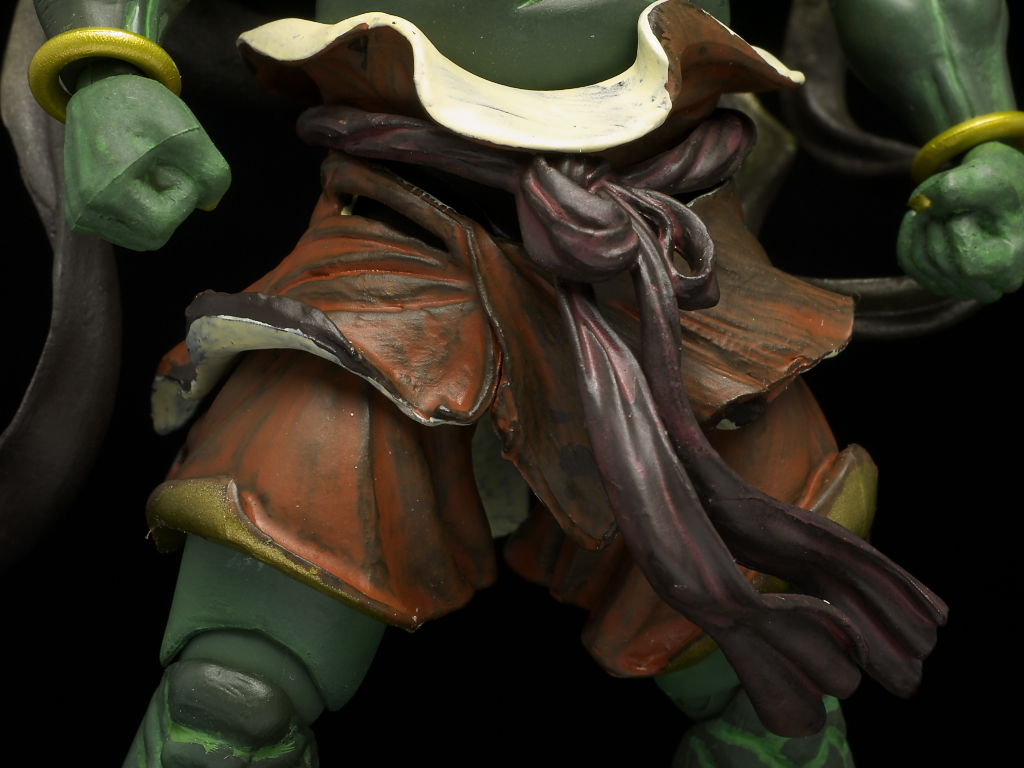 腰回り。腰布、帯は3パーツ構成になっており下2つは軟質素材なので極力可動の妨げにならない作りに。