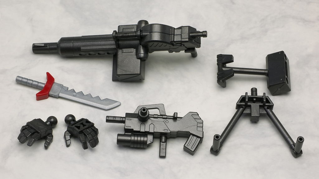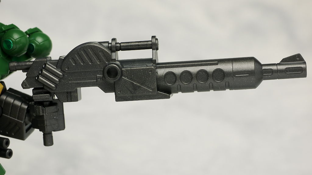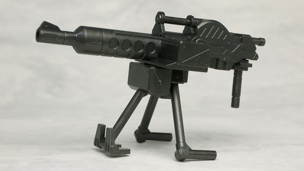 オリジナルギミックとしてバイポッドと銃架ユニットが付属し組み合わせて重機関砲砲座モードを再現可能。