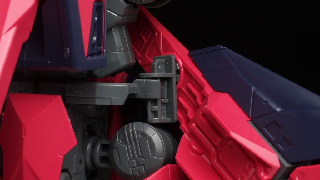 腰回り。変形時複雑に動く部分ですがこちらもロック機構がありMS形態時でも違和感などはなく自然な見た目に。