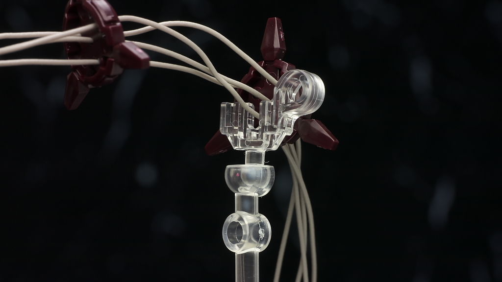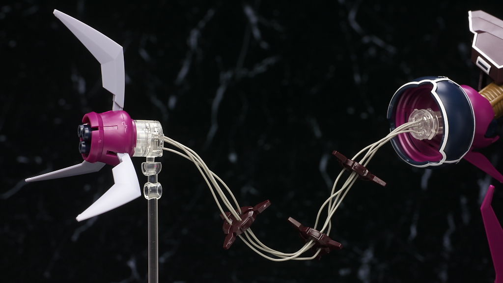 腕部インコムは4本のリード線で射出状態を再現。両腕とも飛ばしたい場合は自分で切る必要があります。
