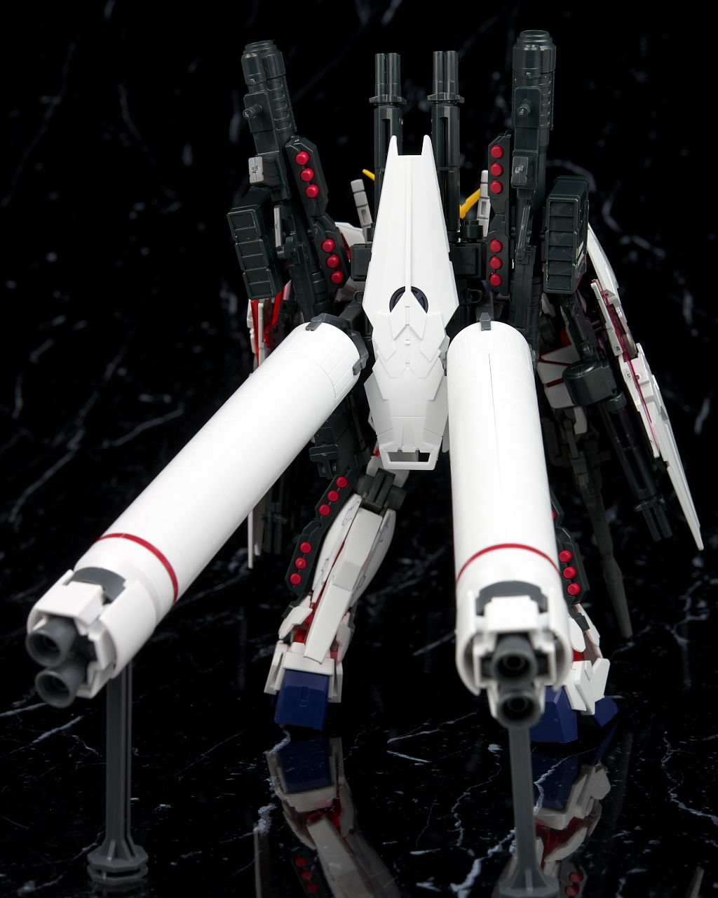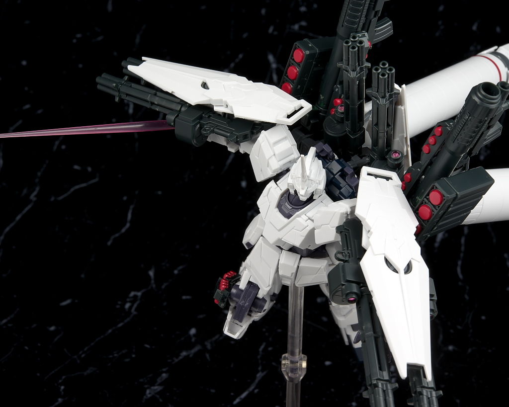 素立ち時はプロペラントタンクがスタンド必須だったり普段のHGに比べるとちょっと面倒な所はあるものの、基部が固定されてるおかげで浮かせてもへたれるようなことはなく、他の武装のポロリなどもほぼなかったので手軽に遊べるFAユニコーンとしてはなかなかオススメだと思います。