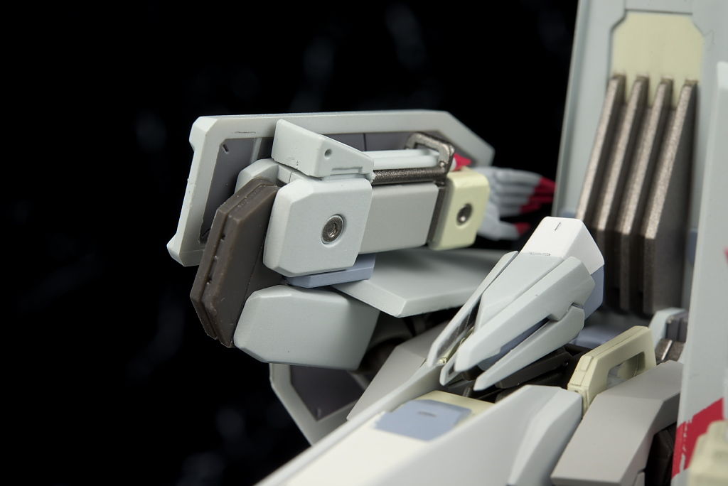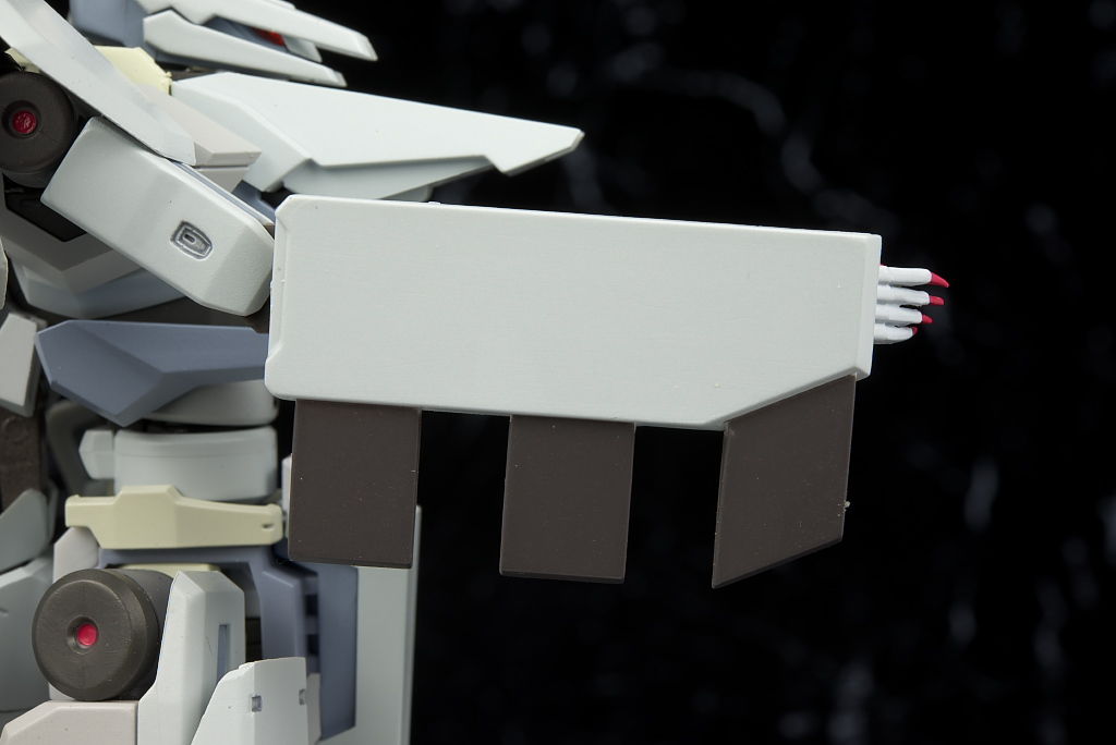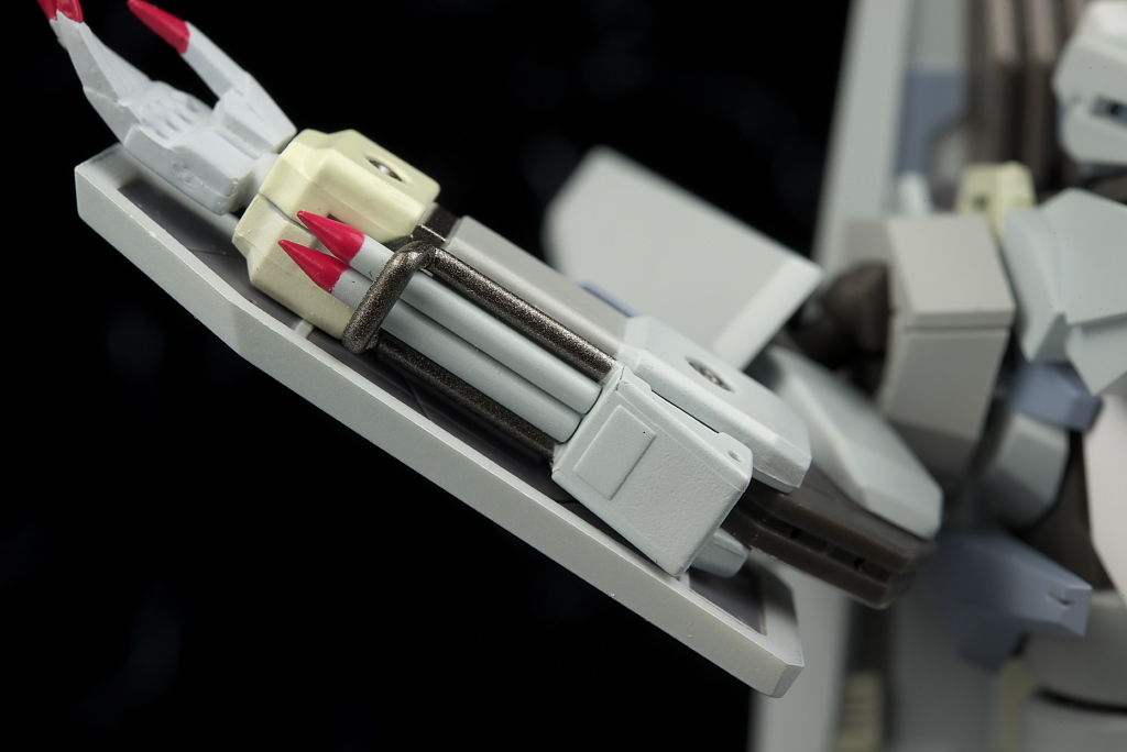 弾体加速装置。こちらは右腕裏側のミサイル部分と差し替えで装備。スライドさせてはめ込む仕様なので保持は安定。