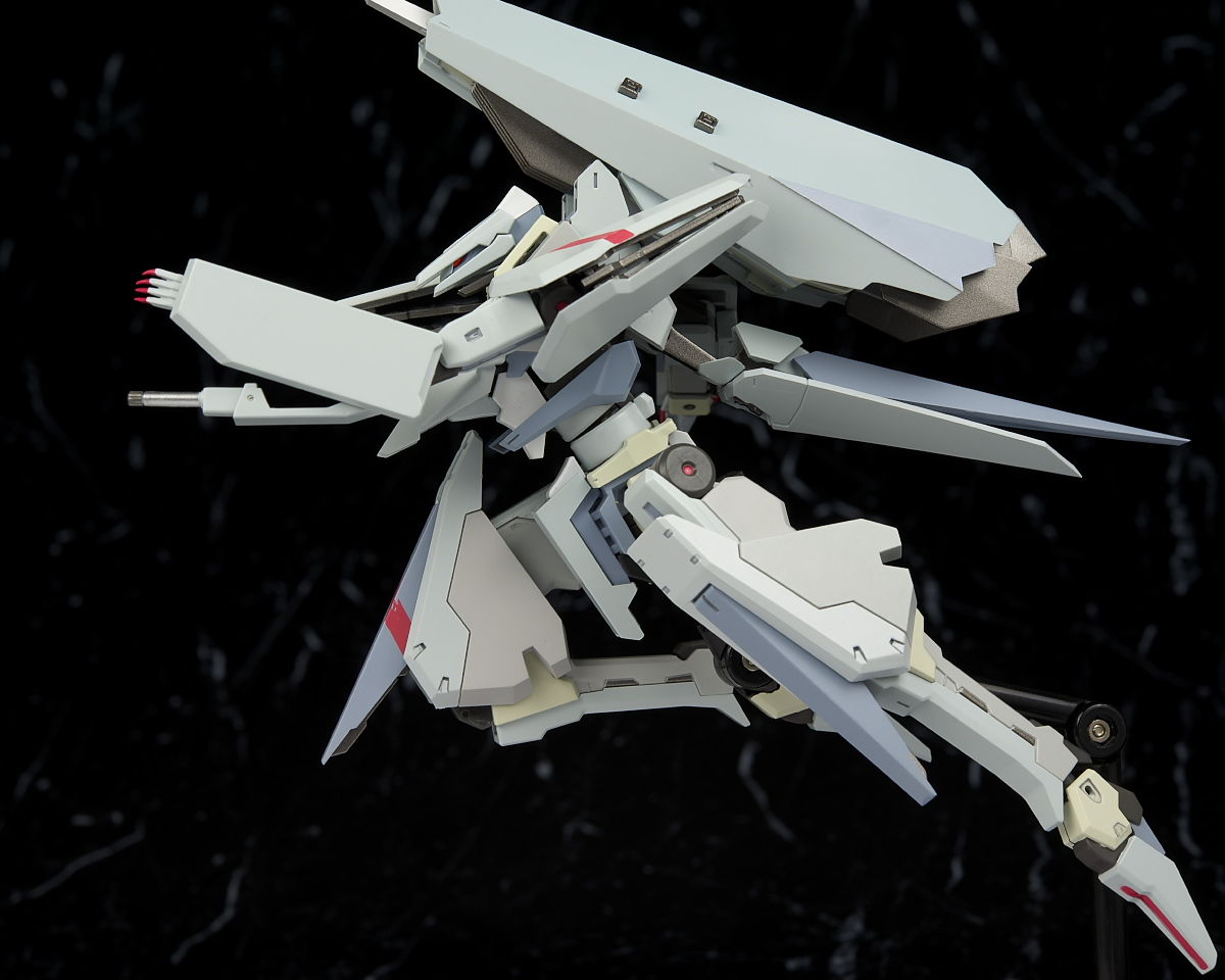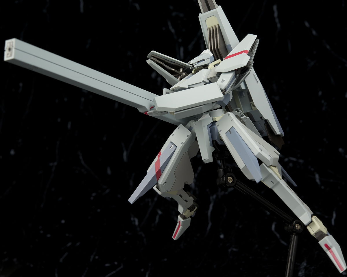 バックパックを展開させて弾体加速装置を付けた状態。高さはありますが機体は細いのでそんなに置き場所はとらなそう。
