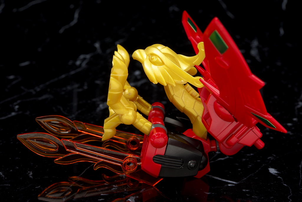 折りたたまれた炎凰がエールストライカーのようになるという面白い作りに。羽が支えになるので自立も容易。