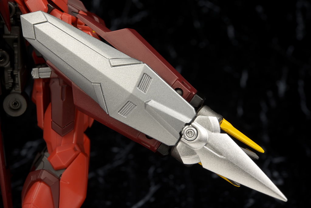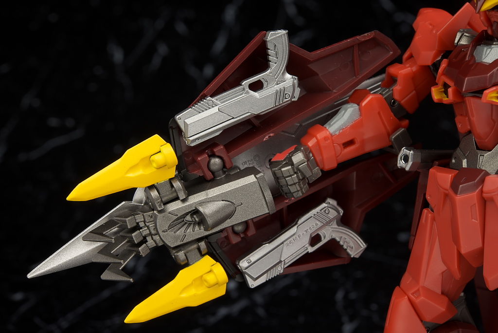 左右のパーツは可動式で内側にはハードポイント付きのハンドガンを装備。先端の黄色い爪も可動。