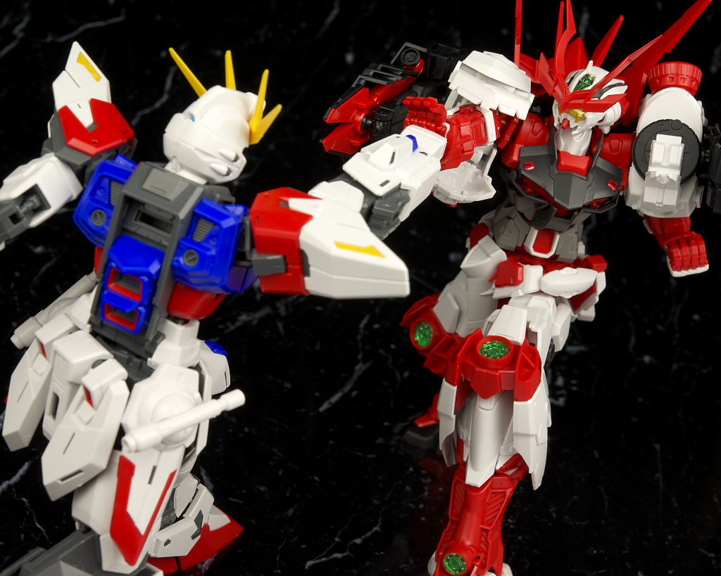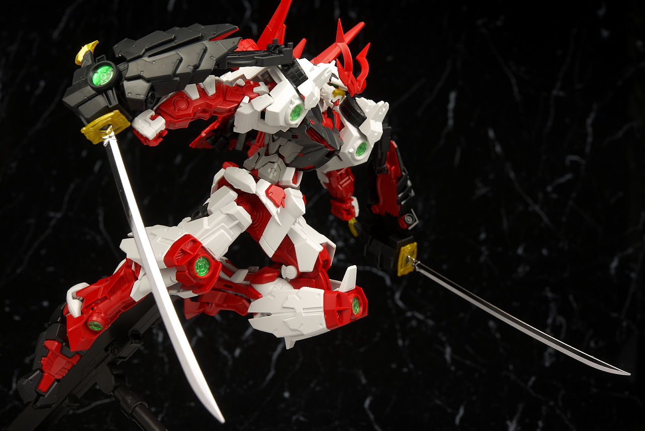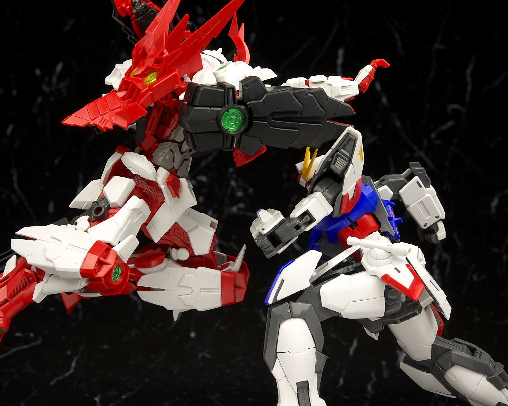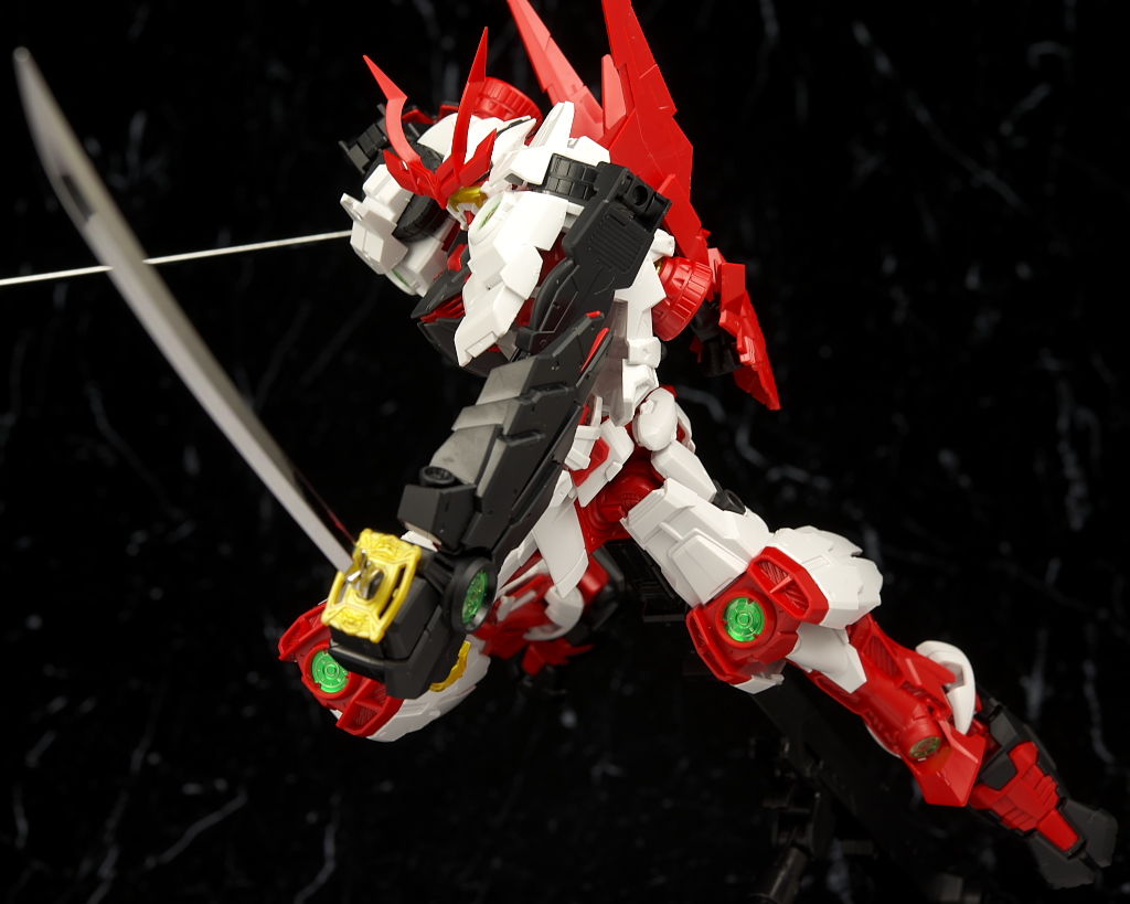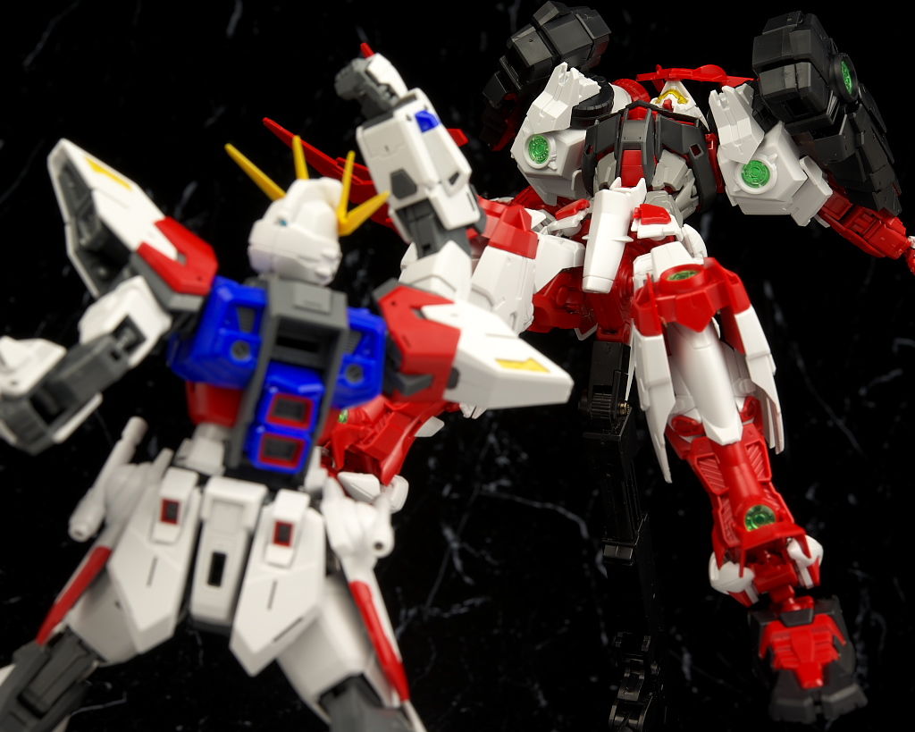 最新のRM Ver.が使われたビルドストライクほど新しくはないのでそちらに比べると多少落ちる面はあるもののこちらの元になってるアストレイもそんなに古くはないのでプロポーションなどは良好でレンズのクリアパーツ化や刀身のメッキ化などHGより色々グレードアップされており非常に格好良かったです。