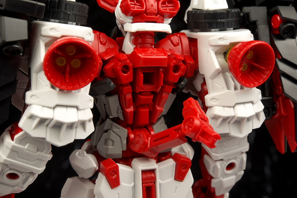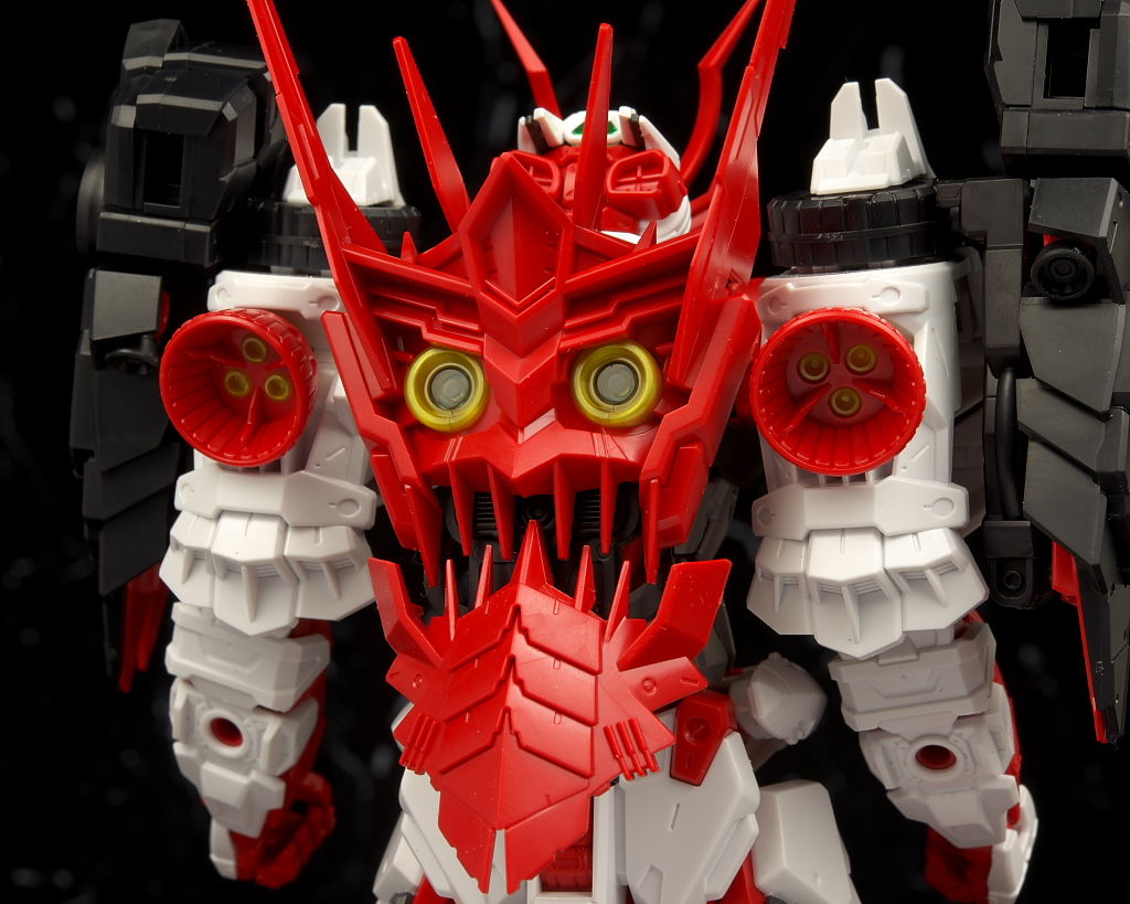 特に新規部分は凝った作りで肩鎧サブアームの基部は回転するようになり伸縮機構も追加されHGより大幅に自由度が増し、鬼面シールドの口の開閉などギミックもより忠実に再現出来るようになり元々の可動の良さも相まって全体的にかなり完成度の高い仕上がりになってました。