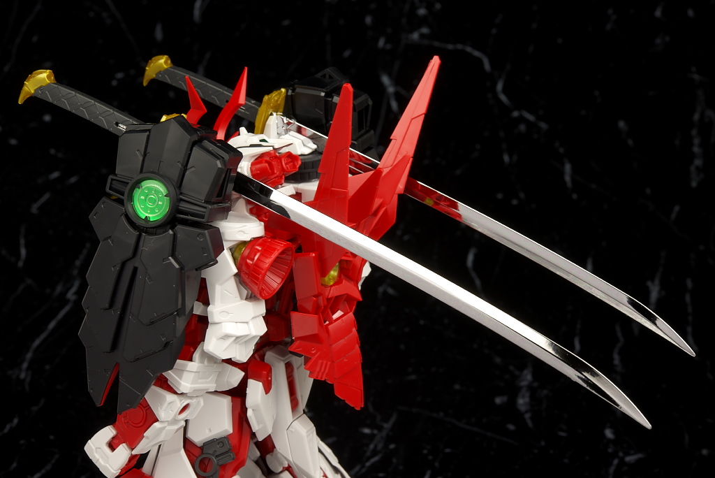 肩パーツは全て新規でこちらもレンズ部分はクリアに。サムライソードの取り付けはHG同様はめ込むだけ。