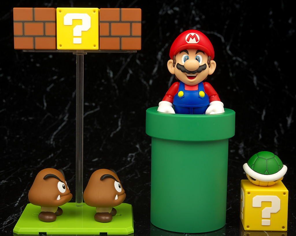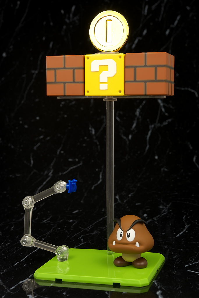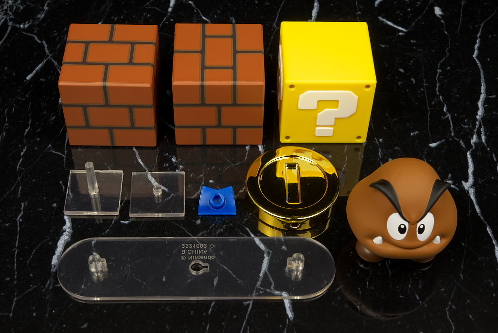 続いてあそべる! プレイセットA。レンガブロックや高めのコインスタンド、クリボー、スタンドジョイントなど様々な物がセットに。