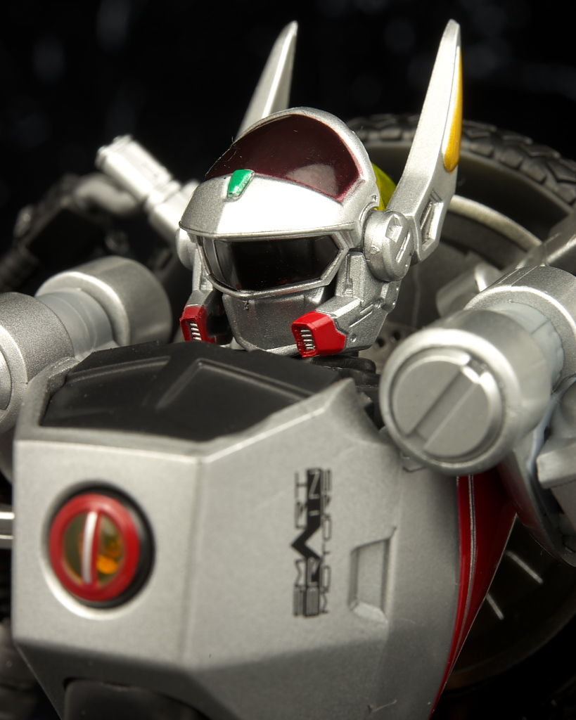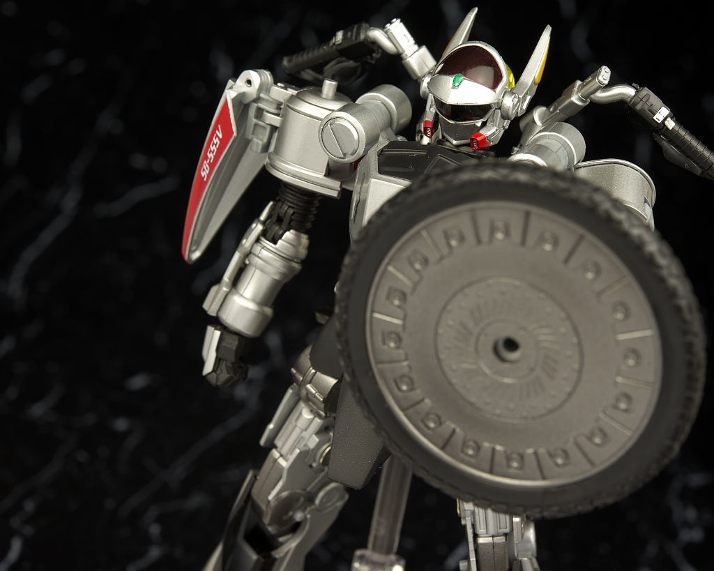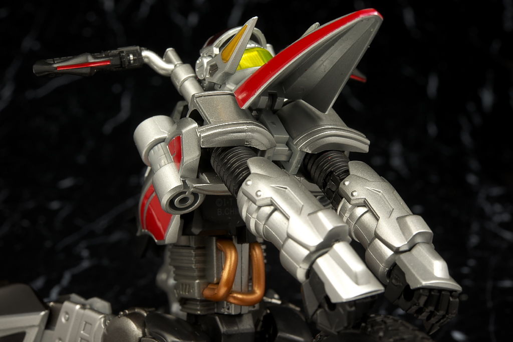 バトルモード全身。やや細身ですが変形ギミック搭載にも関わらずプロポーションなど劇中に近く銀の質感も非常に綺麗。