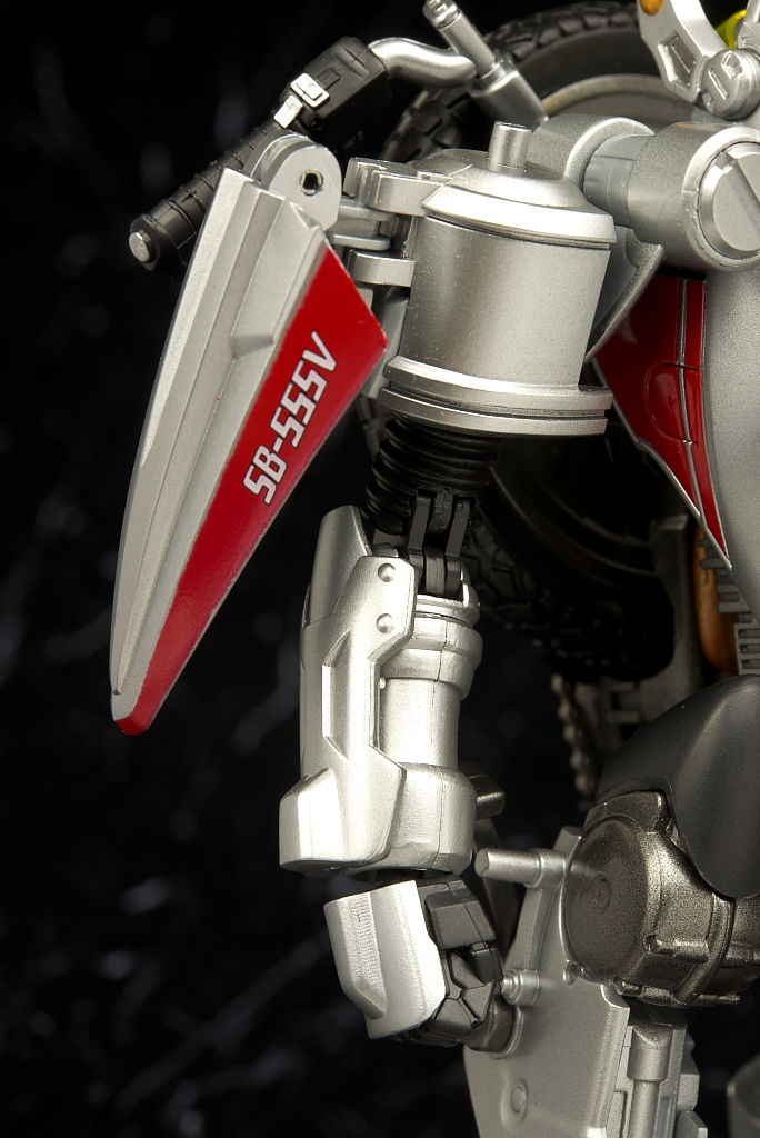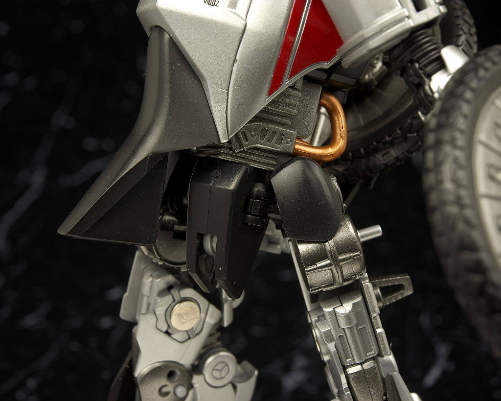 背中のロックを外し後輪を下げ90度回転。手首を交換し、肩を引き下げ二の腕を90度回し、前腕部はアーマー側を前に。