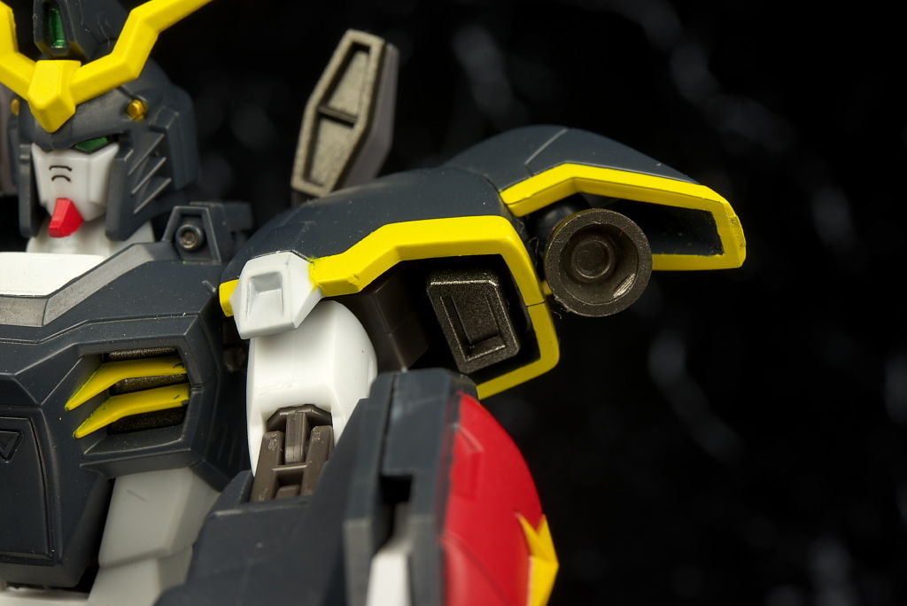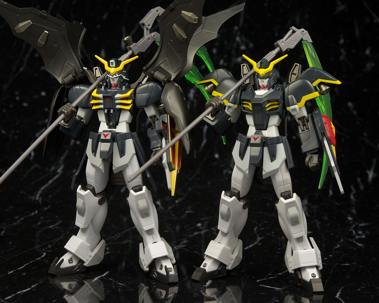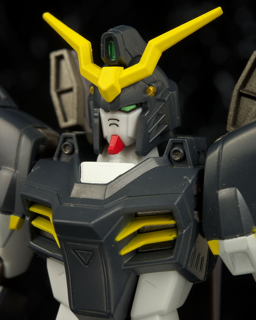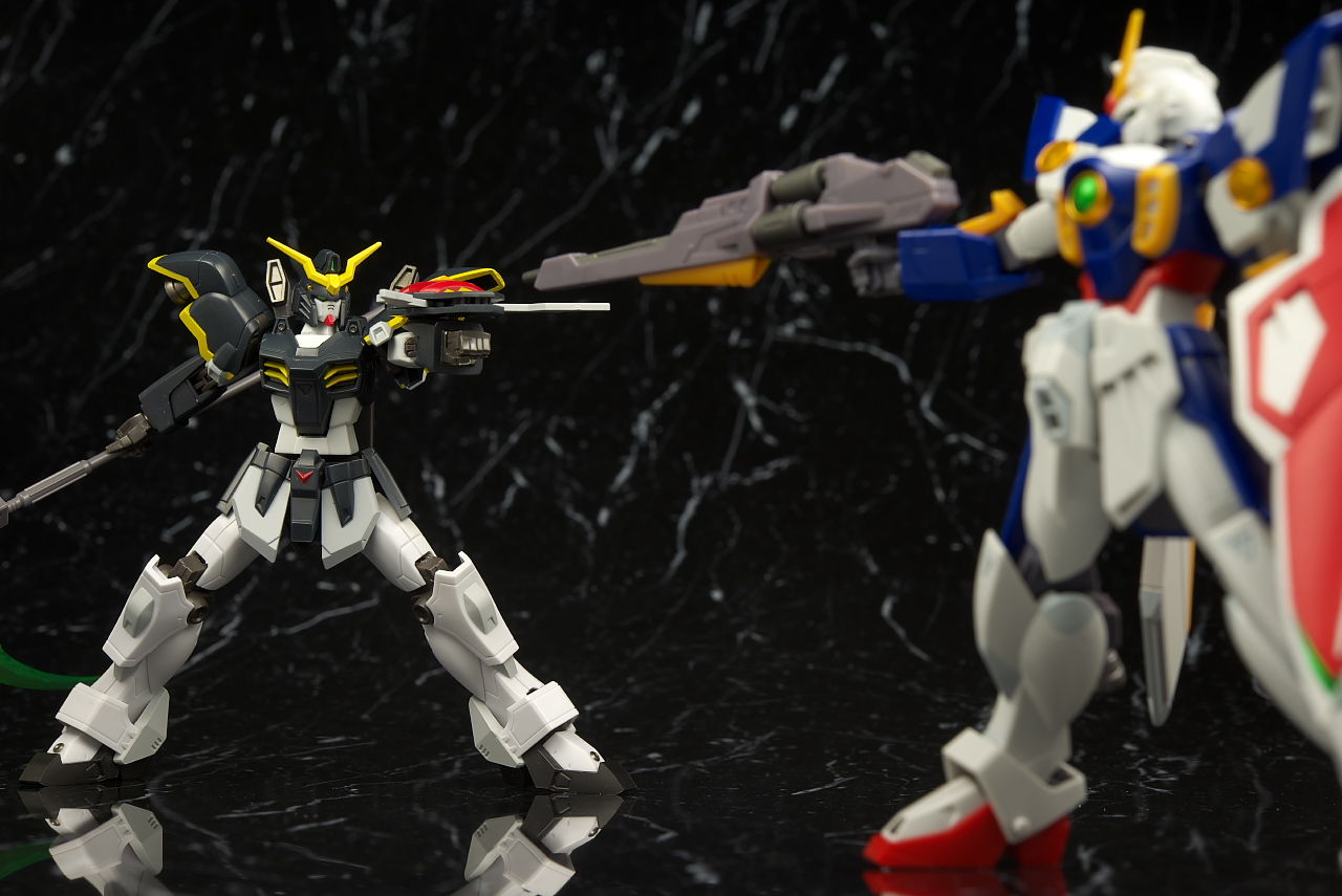 デスサイズヘルと。同じなのは脚部くらいで上半身は別物に。白黒の色もほぼ同じですが黄色はやや薄くなってました。