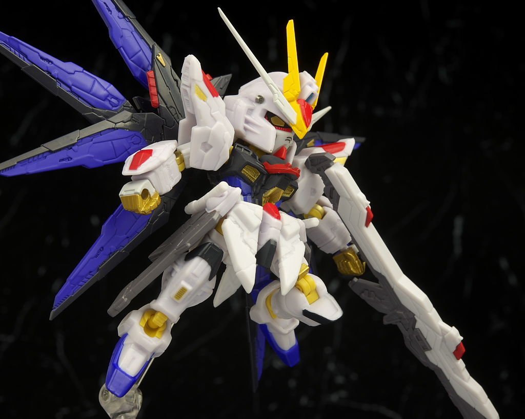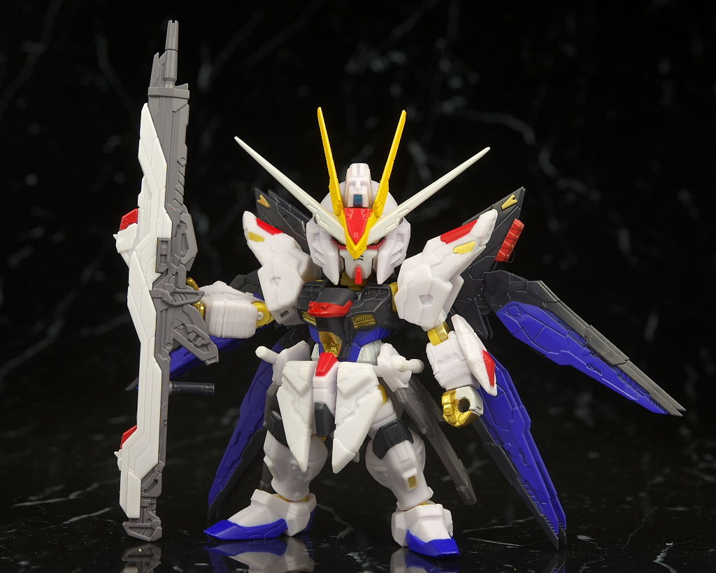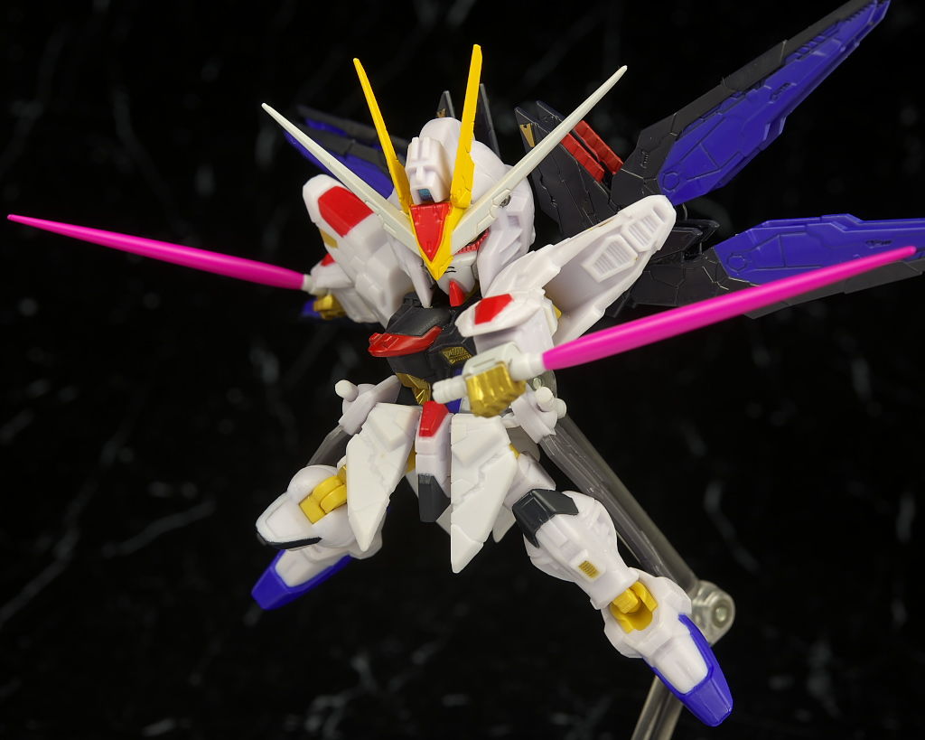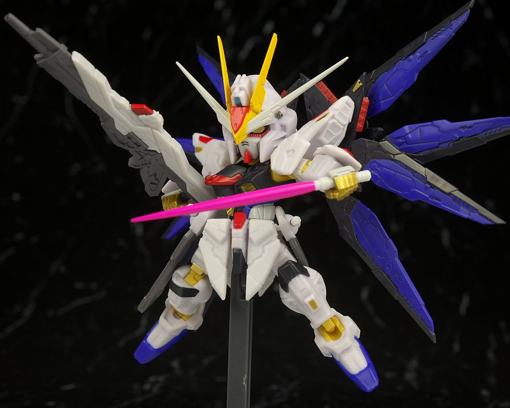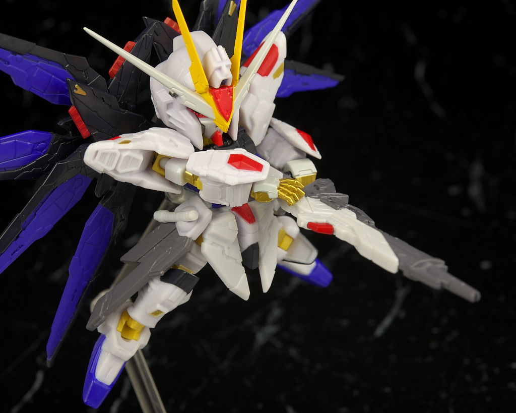 可動もデフォルメながら肘膝などきっちり曲がり腰も回るので動かしやすかったですが、ただ分離した状態のライフルが付かなかったりレール砲の展開、ドラグーンの分離がなかったりとギミック面は省略が多くプレイバリューは既存のストフリの立体物と比べるとだいぶ控えめだったのでこの辺は賛否分かれそう。