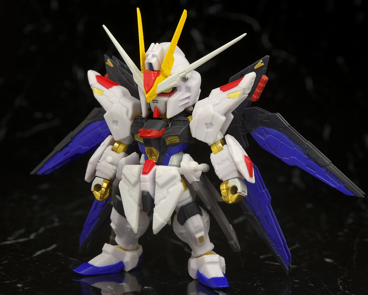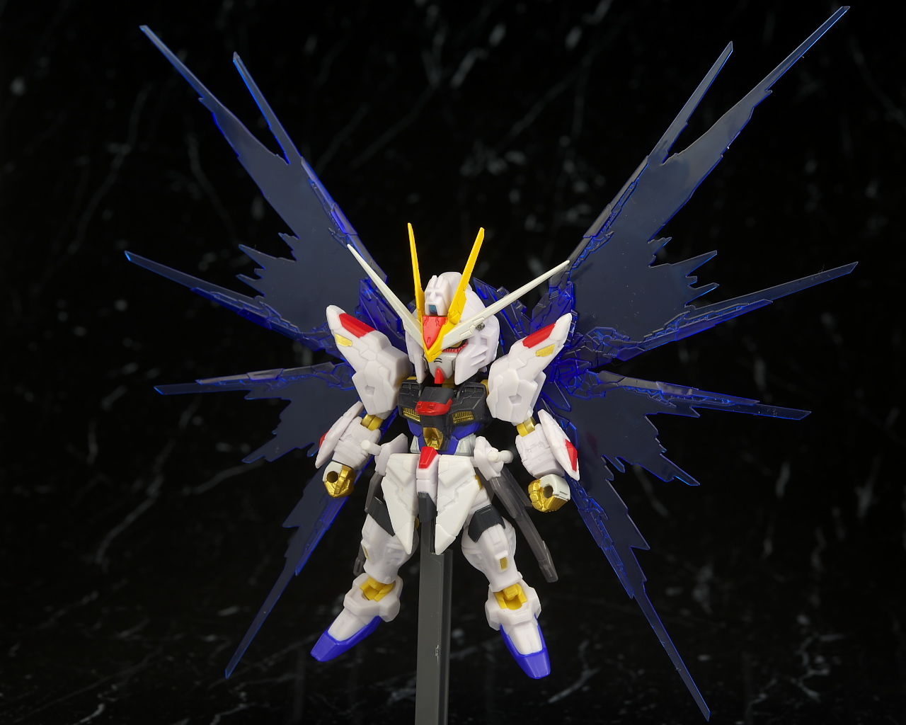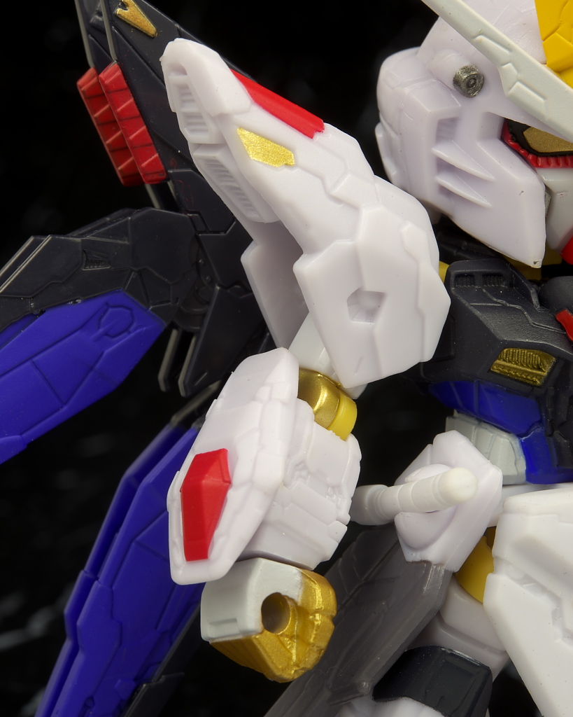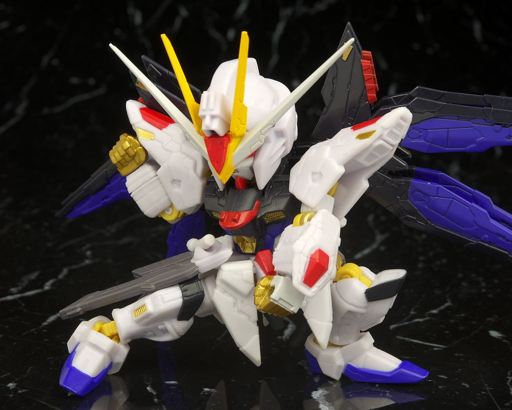 可動もデフォルメながら肘膝などきっちり曲がり腰も回るので動かしやすかったですが、ただ分離した状態のライフルが付かなかったりレール砲の展開、ドラグーンの分離がなかったりとギミック面は省略が多くプレイバリューは既存のストフリの立体物と比べるとだいぶ控えめだったのでこの辺は賛否分かれそう。