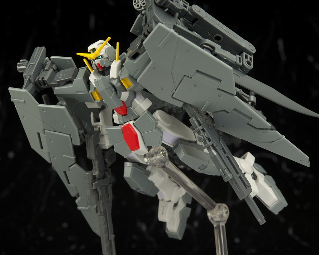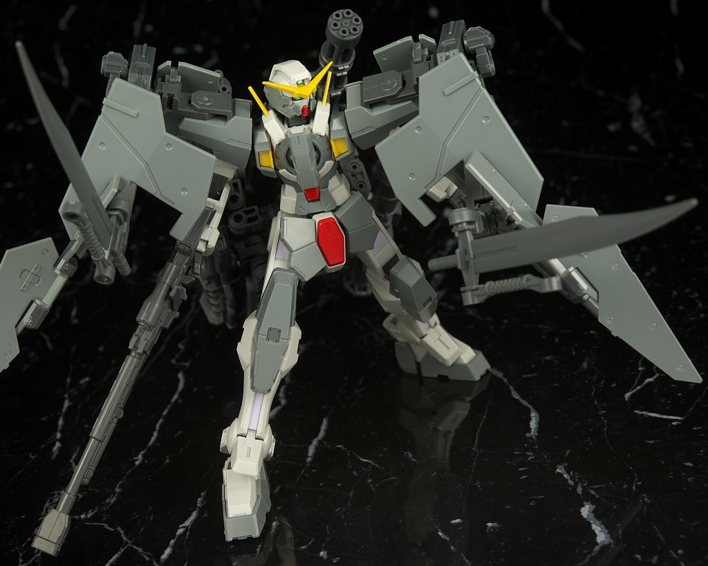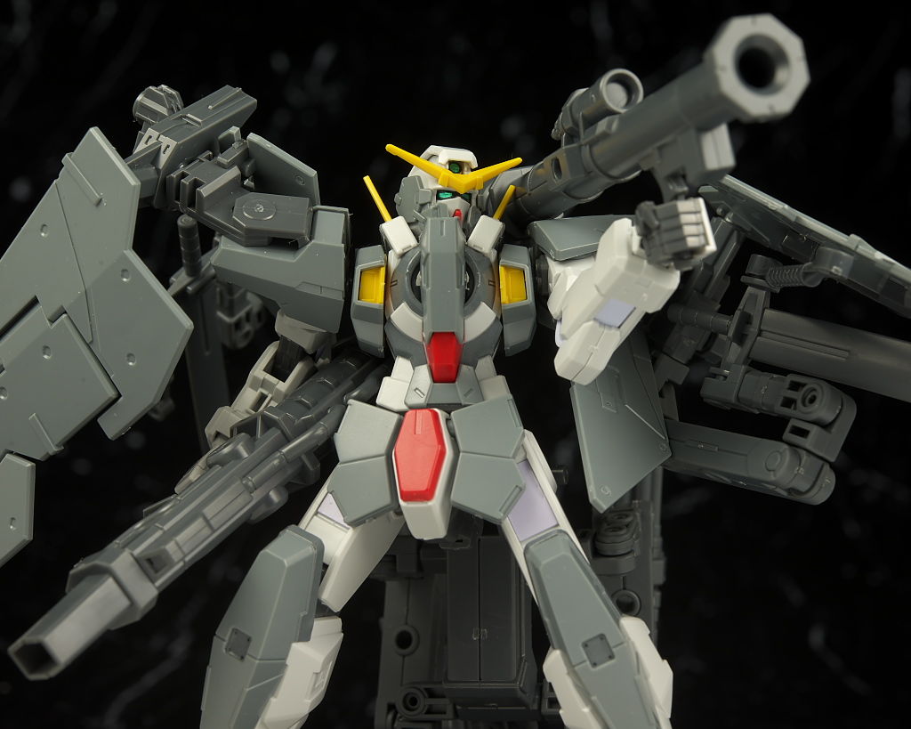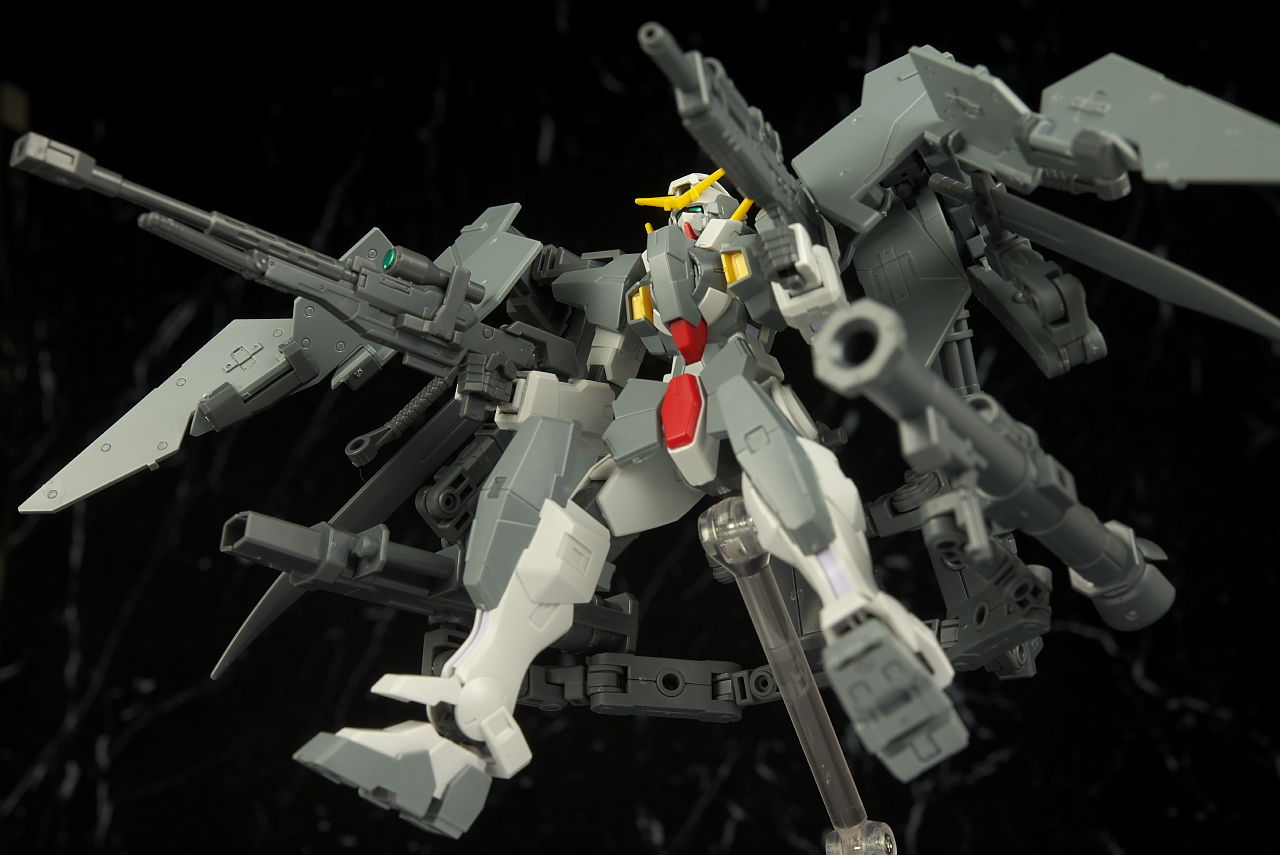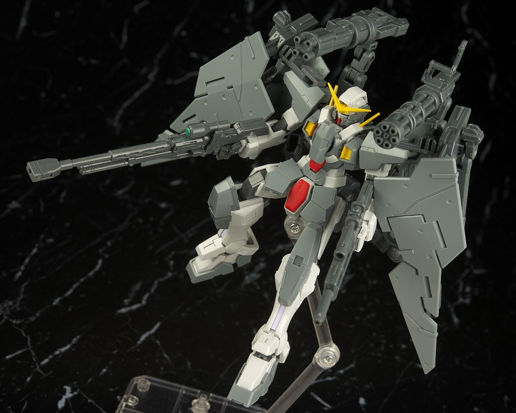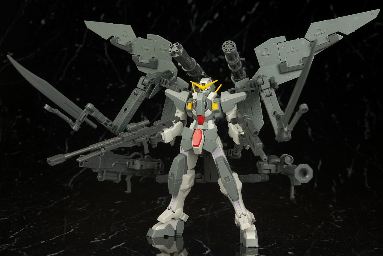 本体のデュナメスがかなり前に出たキットなので今から見ると色分け、可動など多少見劣りする所はあるものの今回はアームや大量の武器がメインなのでさほど気にならず、それらもミリタリーテイストの強い機体デザインと合っててオリジナル物ながら様になってました。