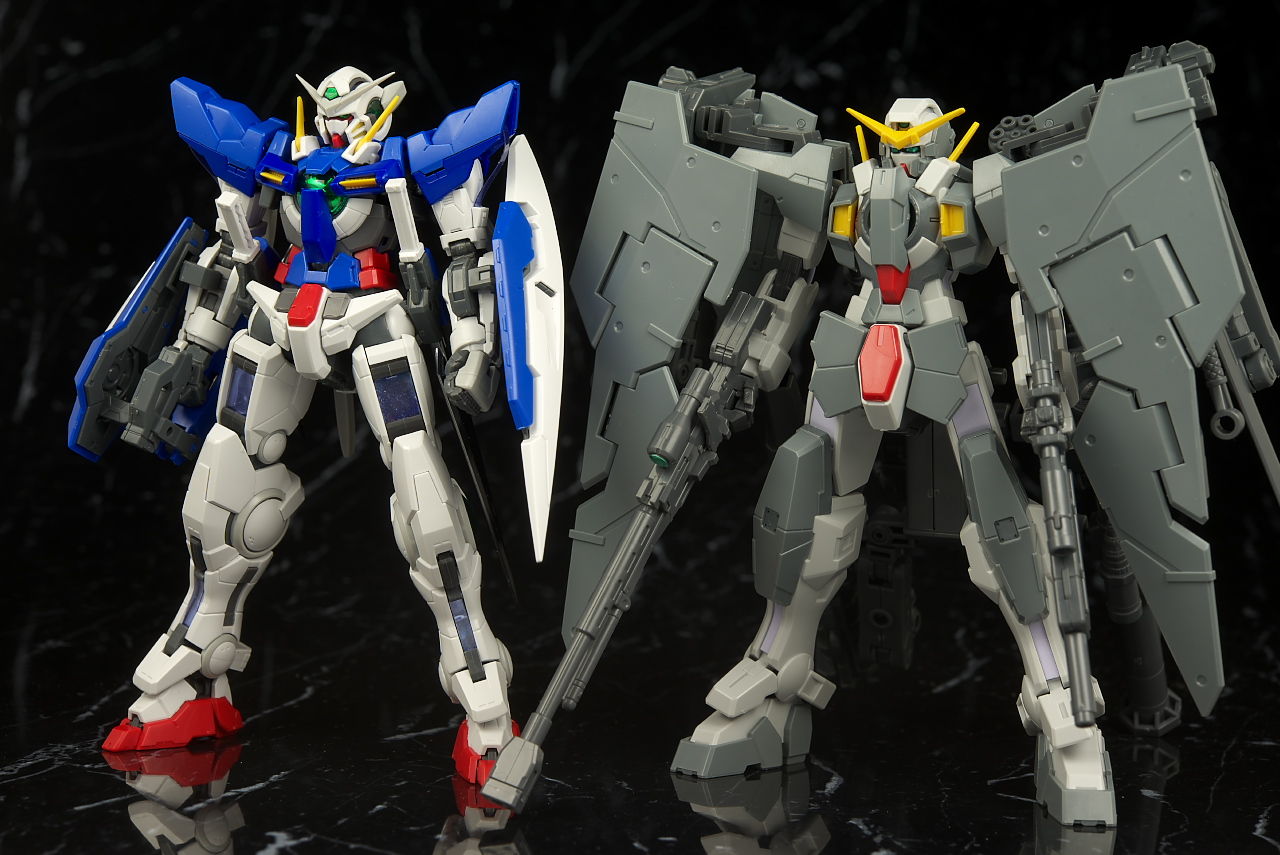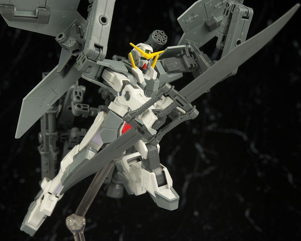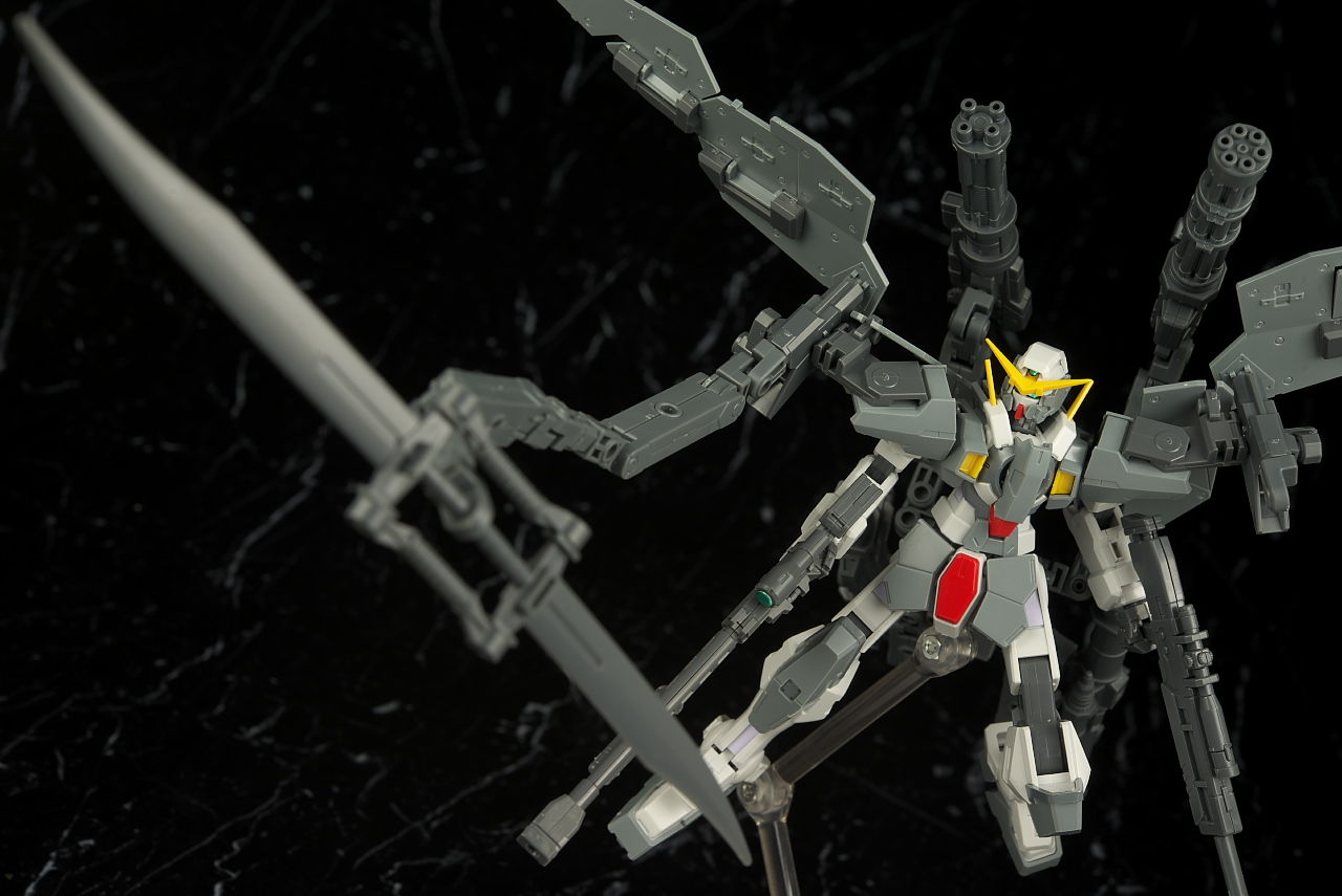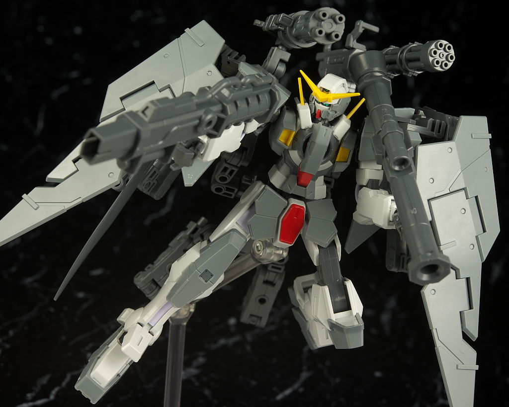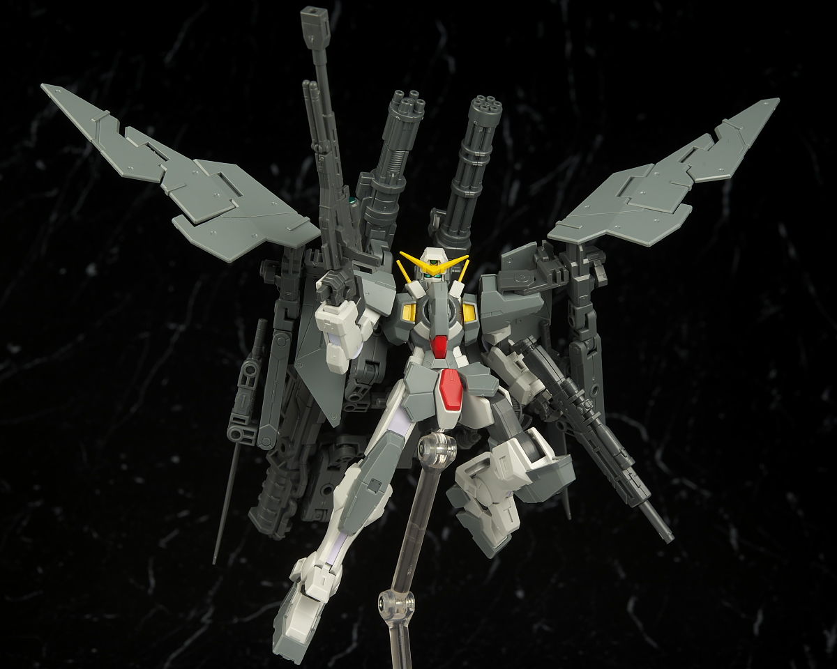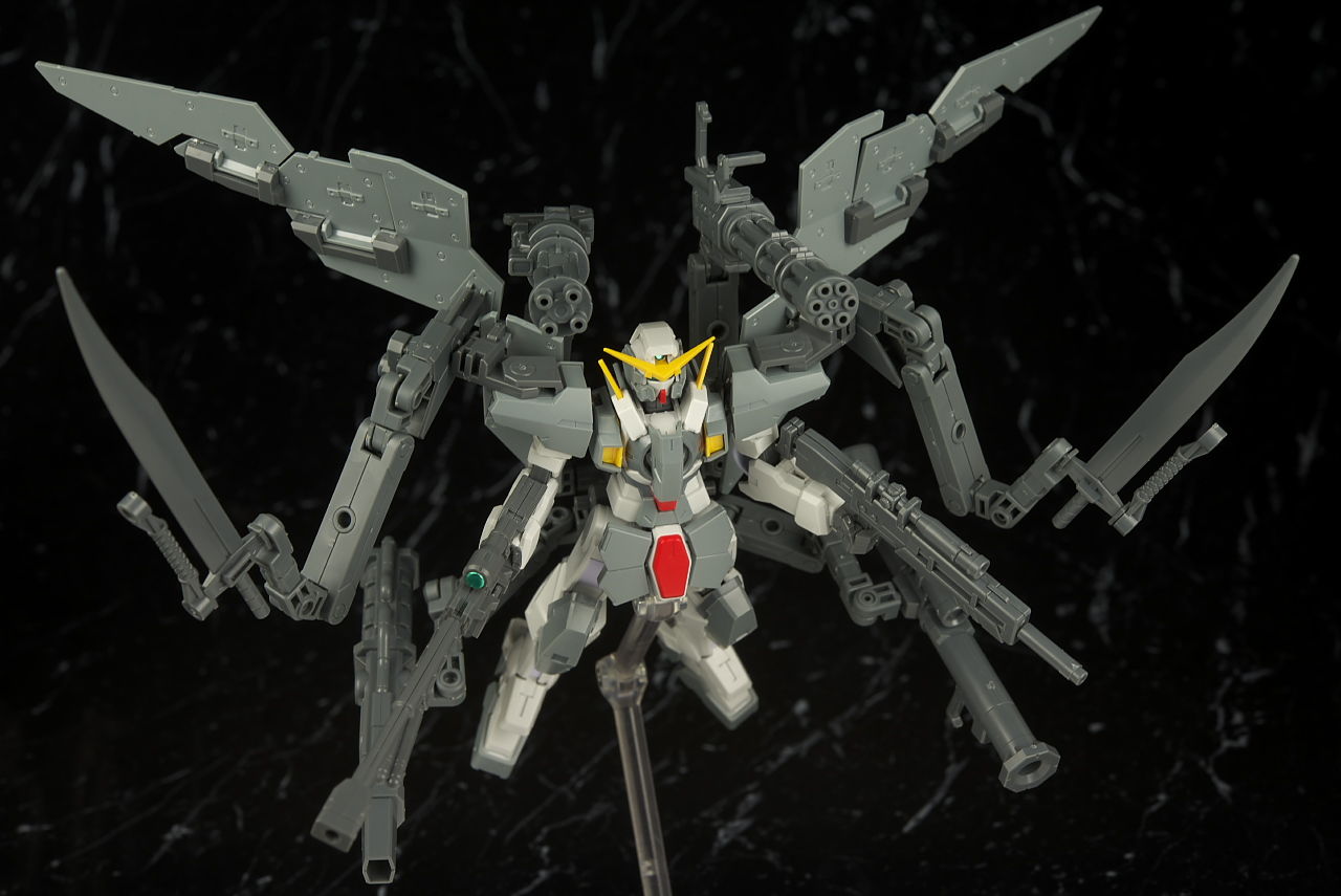 本体のデュナメスがかなり前に出たキットなので今から見ると色分け、可動など多少見劣りする所はあるものの今回はアームや大量の武器がメインなのでさほど気にならず、それらもミリタリーテイストの強い機体デザインと合っててオリジナル物ながら様になってました。