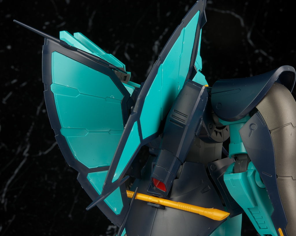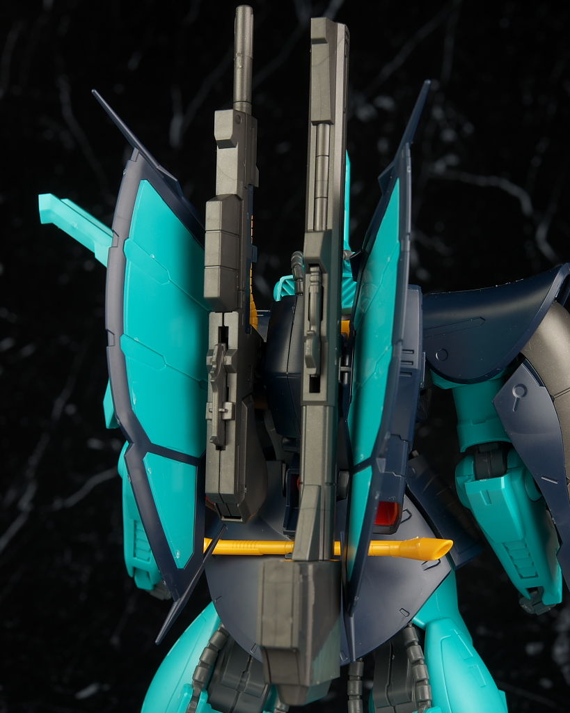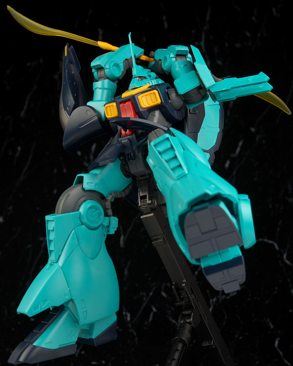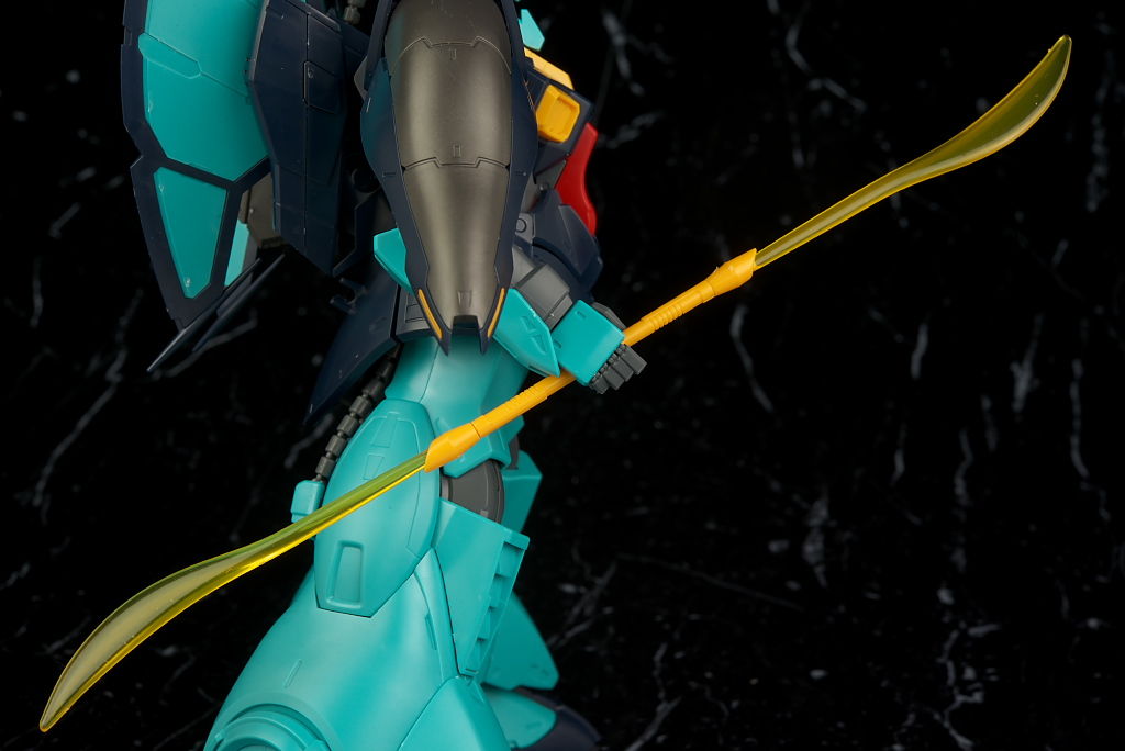 背中。後頭部のチューブは軟質素材でバックパックに接続。腰にはビームナギナタの柄を装備。