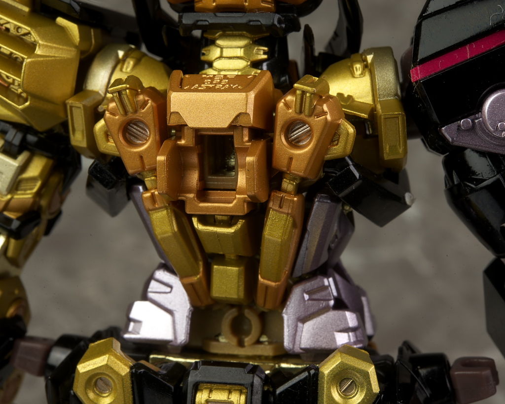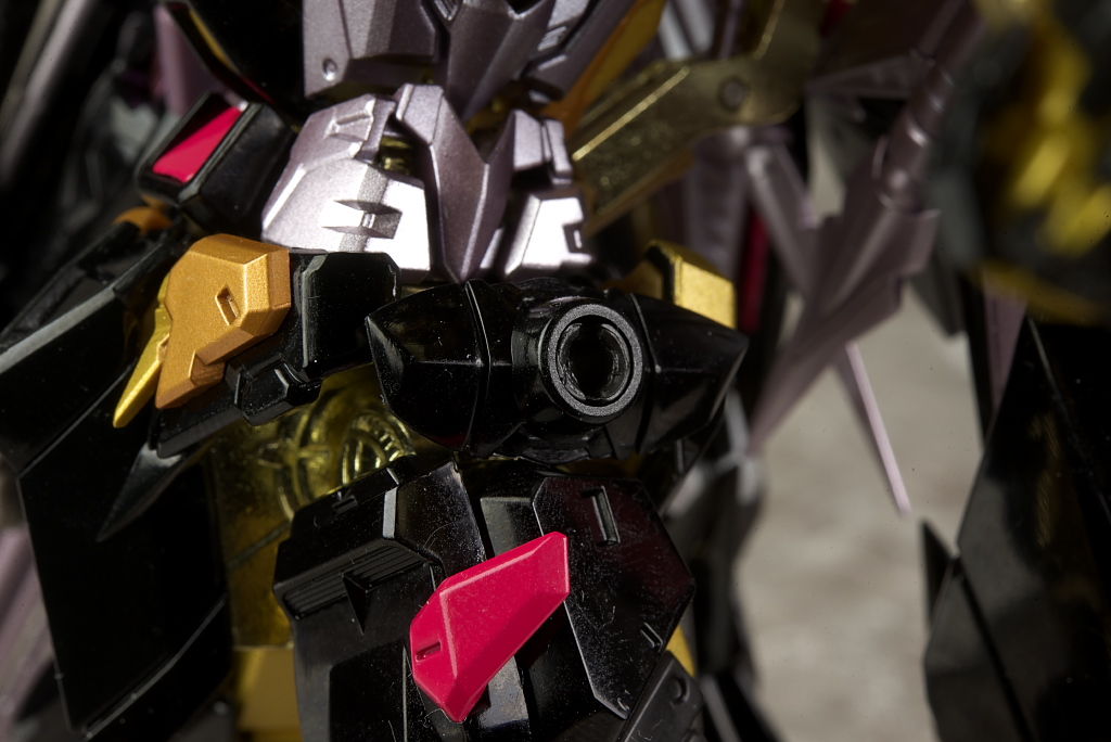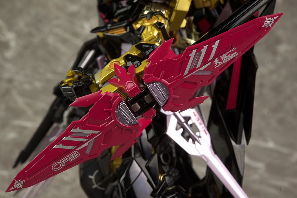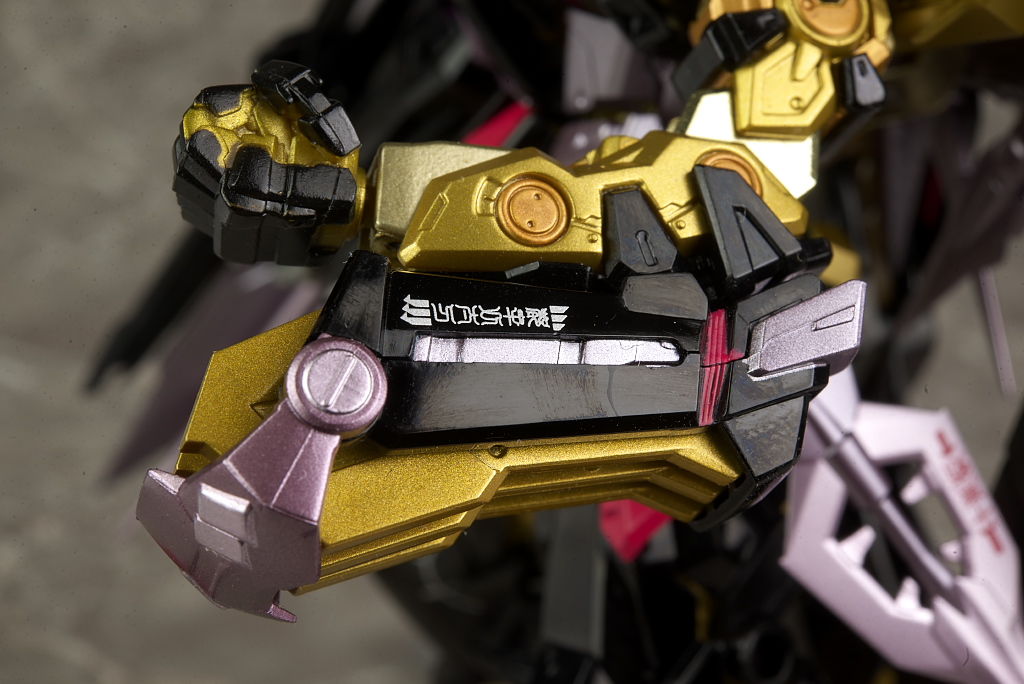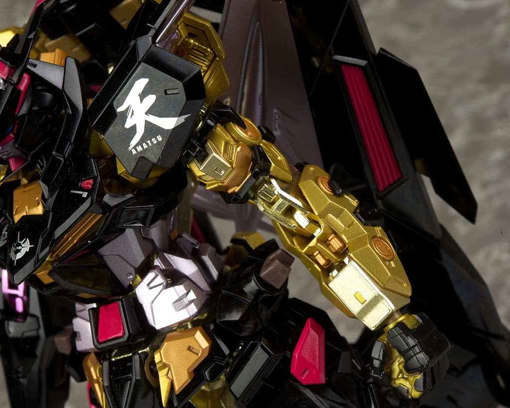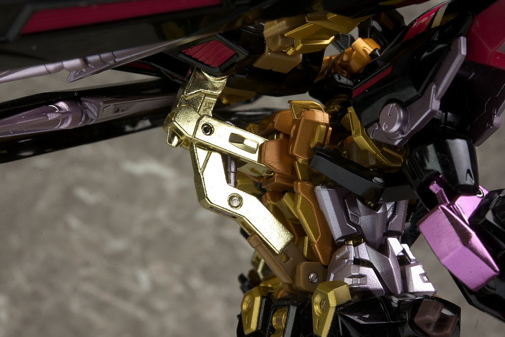 左腕はフレーム剥き出しで肩の天の文字も含め特に主張が強い部分。金が2色使われてるので立体感も強調されてました。