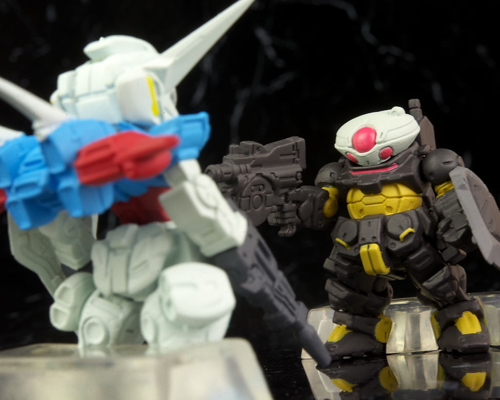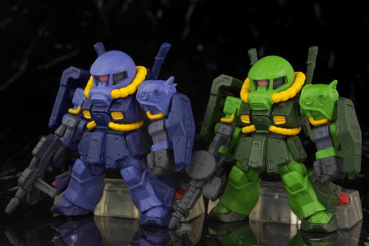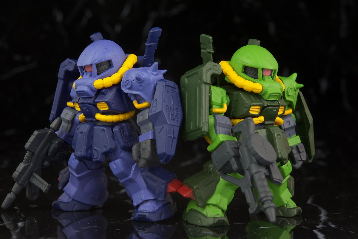 2体並べて。武器はティターンズがザクマシンガンで連邦カラーがビームライフル。