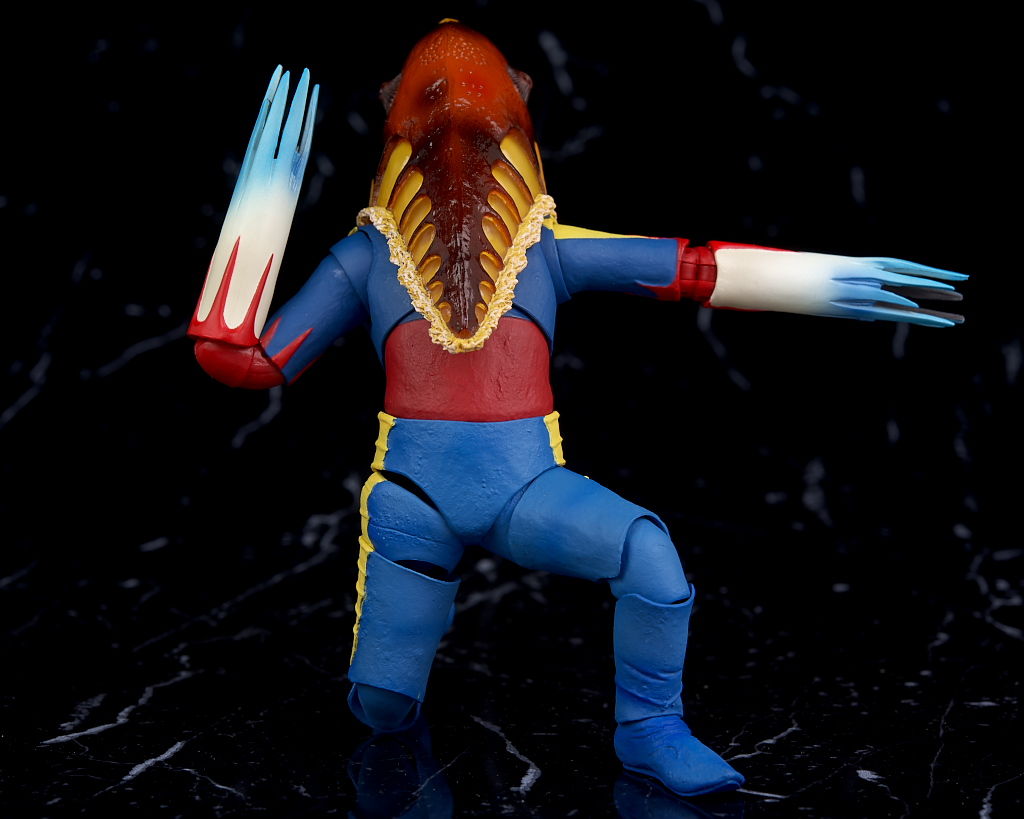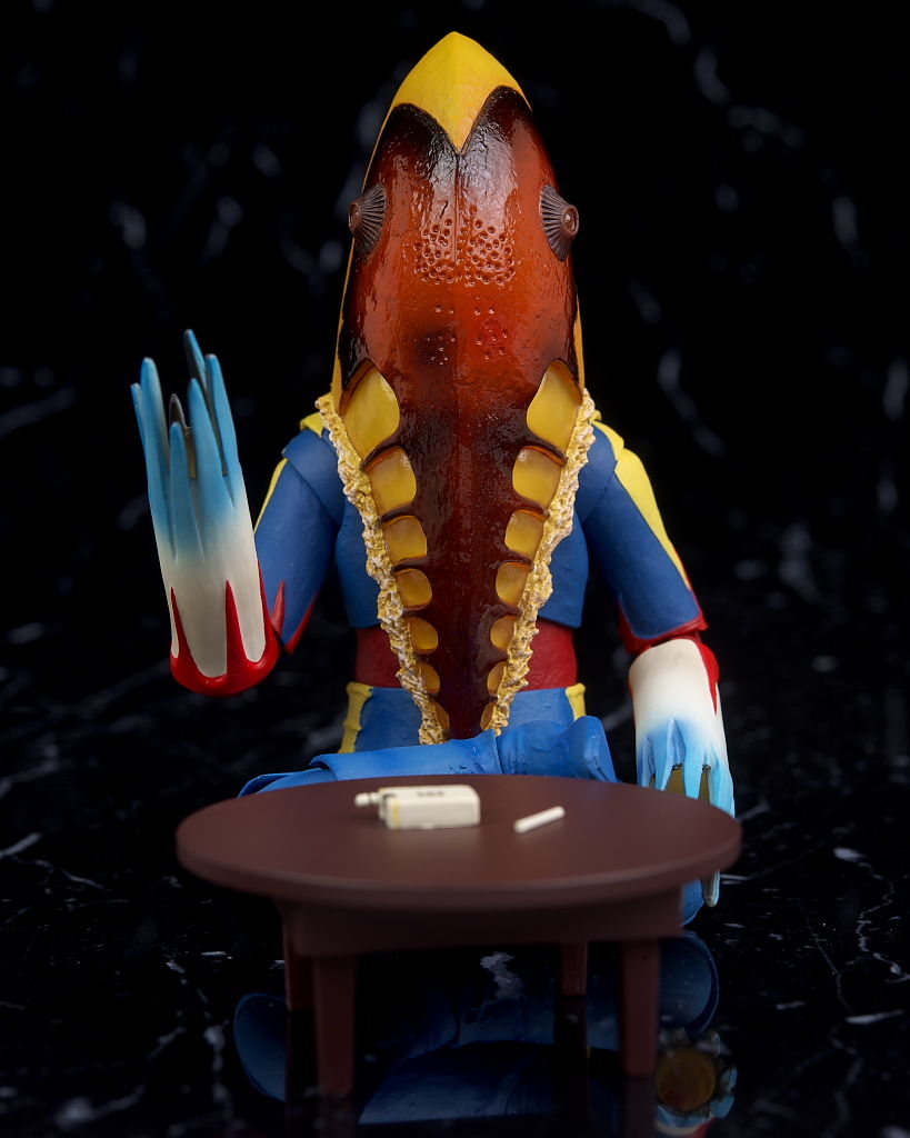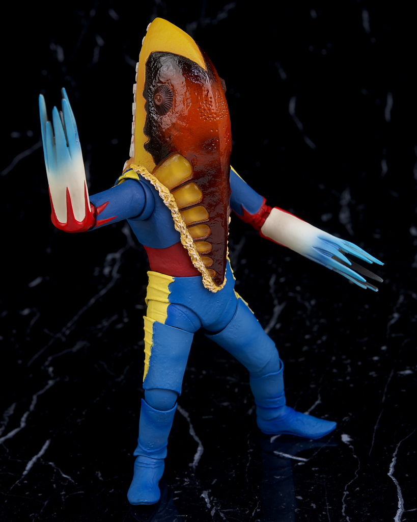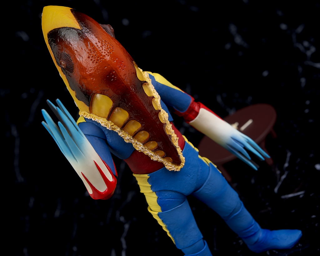 顔。形状や目など魚のようなかなり奇抜なデザイン。皮膚の質感なども塗装でリアルに再現。