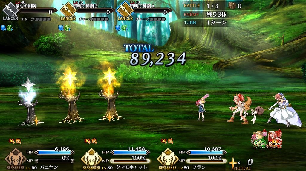 ・配布のリヨ鯖はレベル100の凸カレでATK2000上げてもスキル使わないと種火を確殺出来ない火力の低さは難点ですが、宝具演出が早く、低レアのバーサーカーは絆MAXになってる物が多いので、今後も周回用として結構使っていけそう。