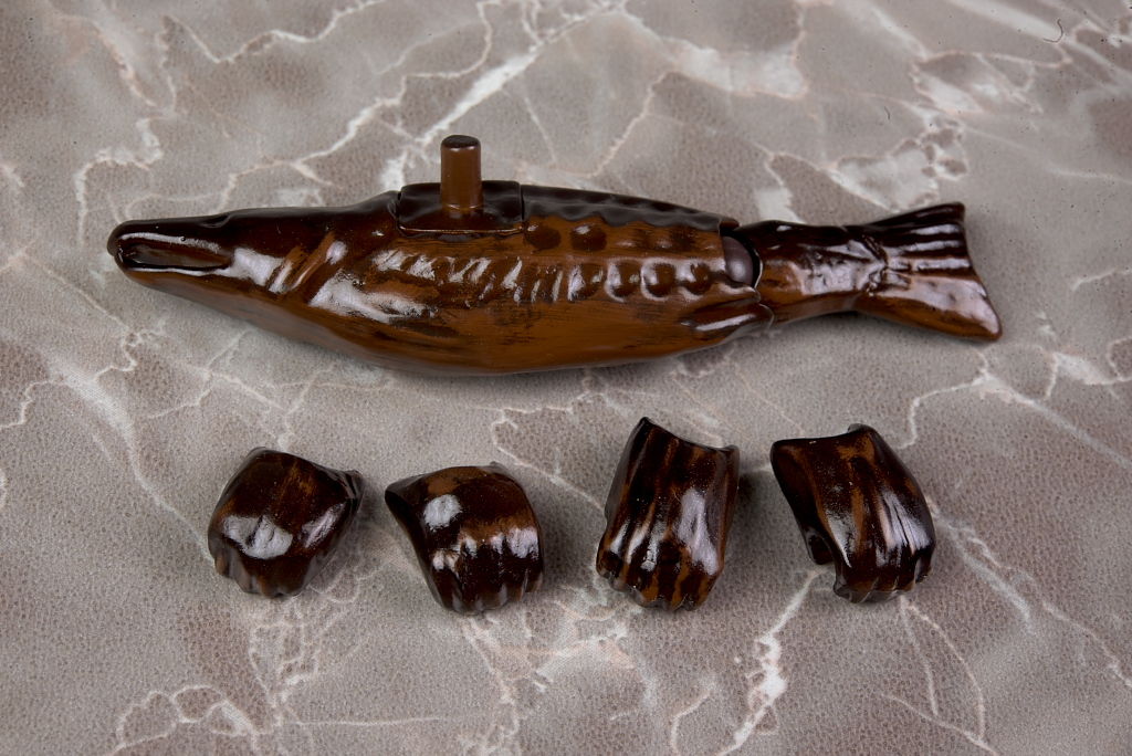 鮭。こちらはピンがあり口の上に取り付け可能。また尾びれ部分はジョイント可動。