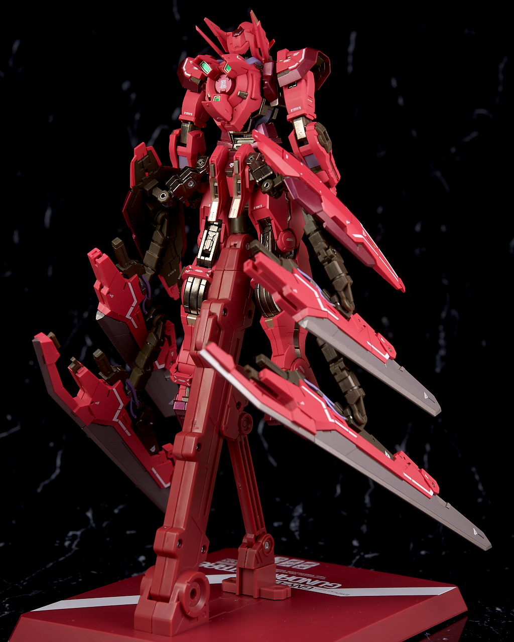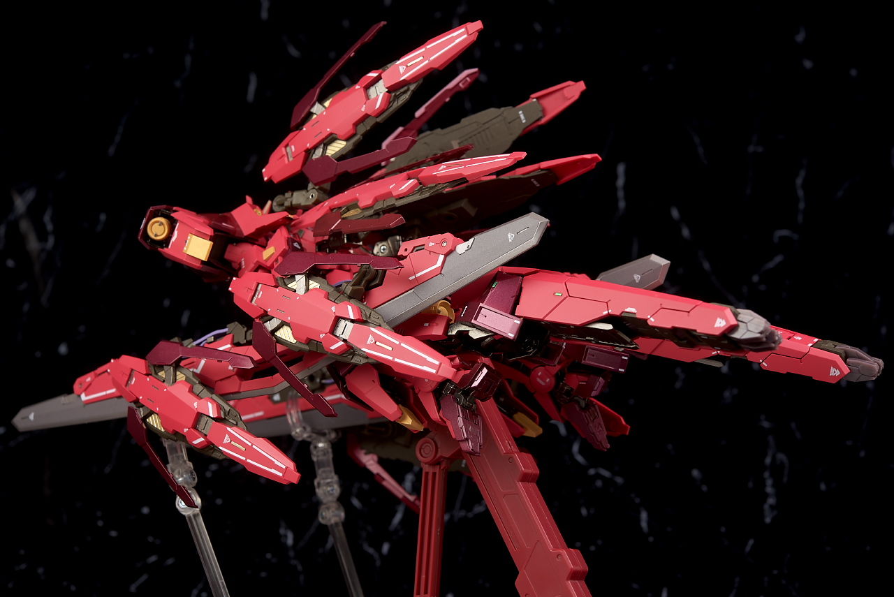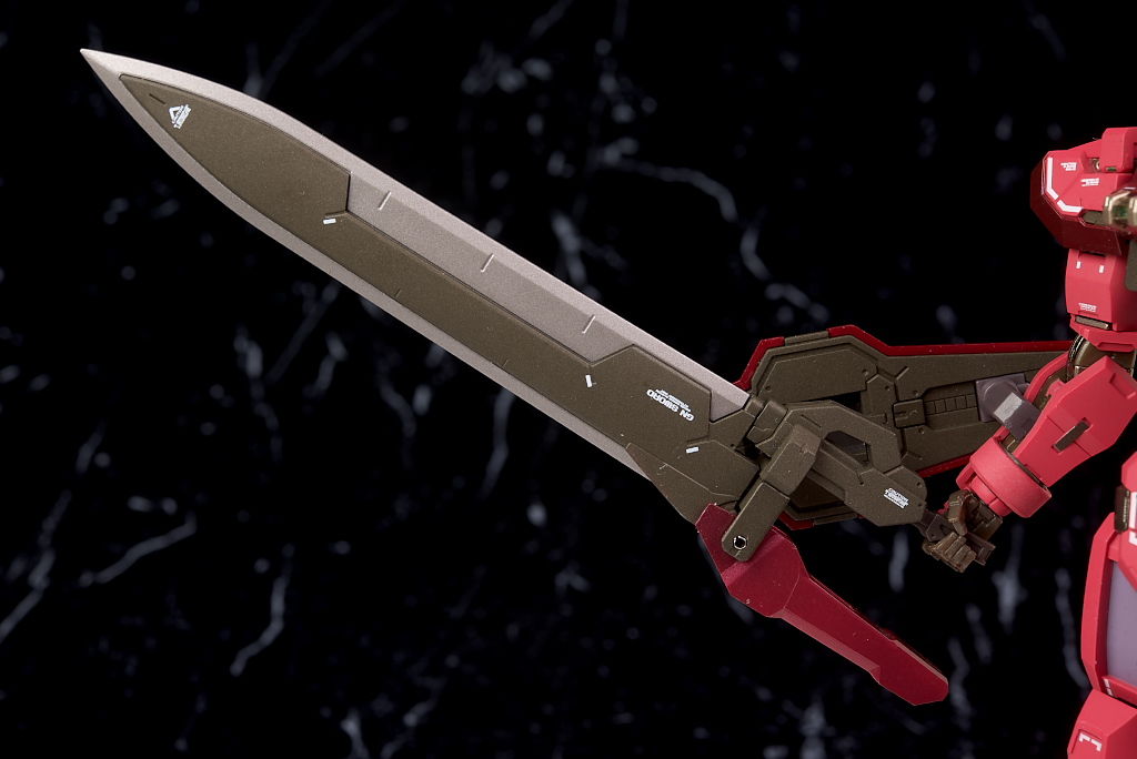 肩装甲を展開し、両手にブロードブレイドを持たせ前傾姿勢にして固定すれば完成。なおこちらでは補助支柱が必要でした。