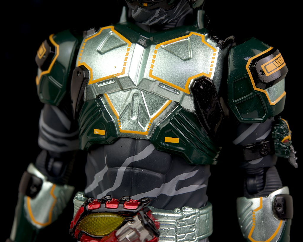 顔。これまでの他のアマゾンズライダーに比べると生物感が薄く、カラーリングなどもミリタリー色が濃いデザインに。
