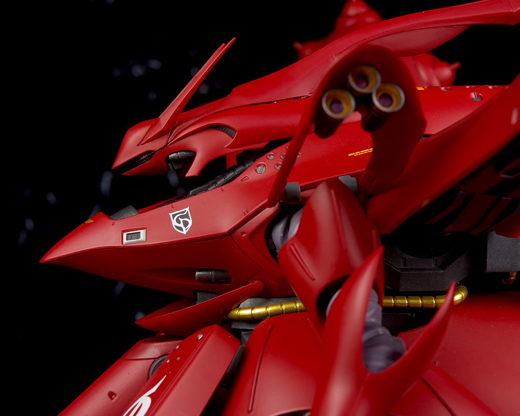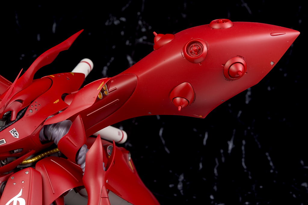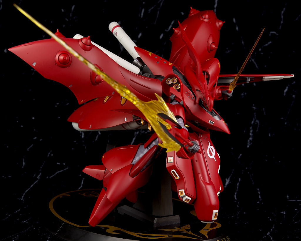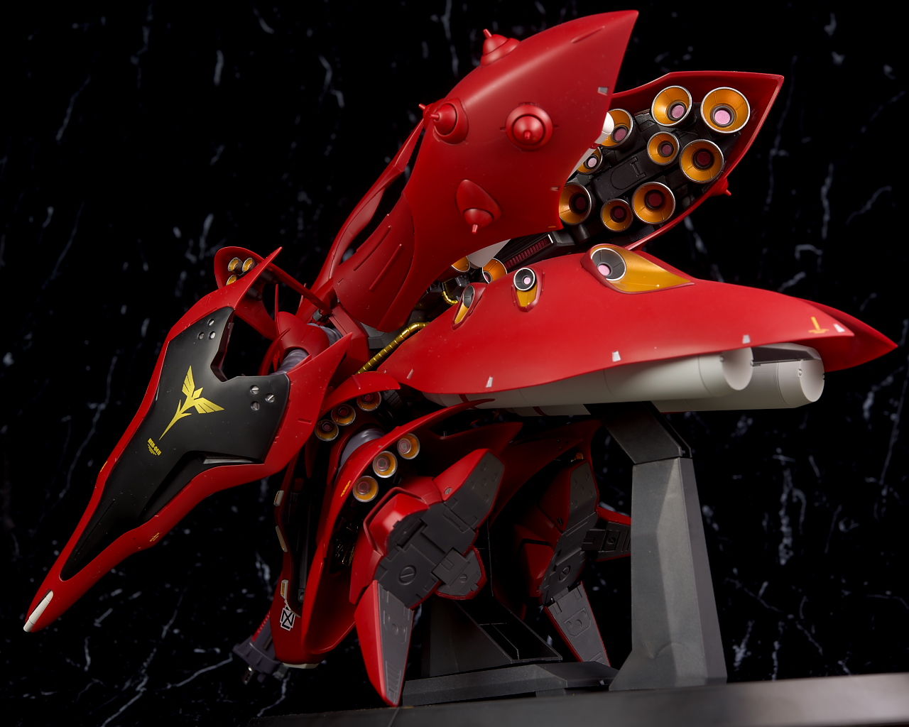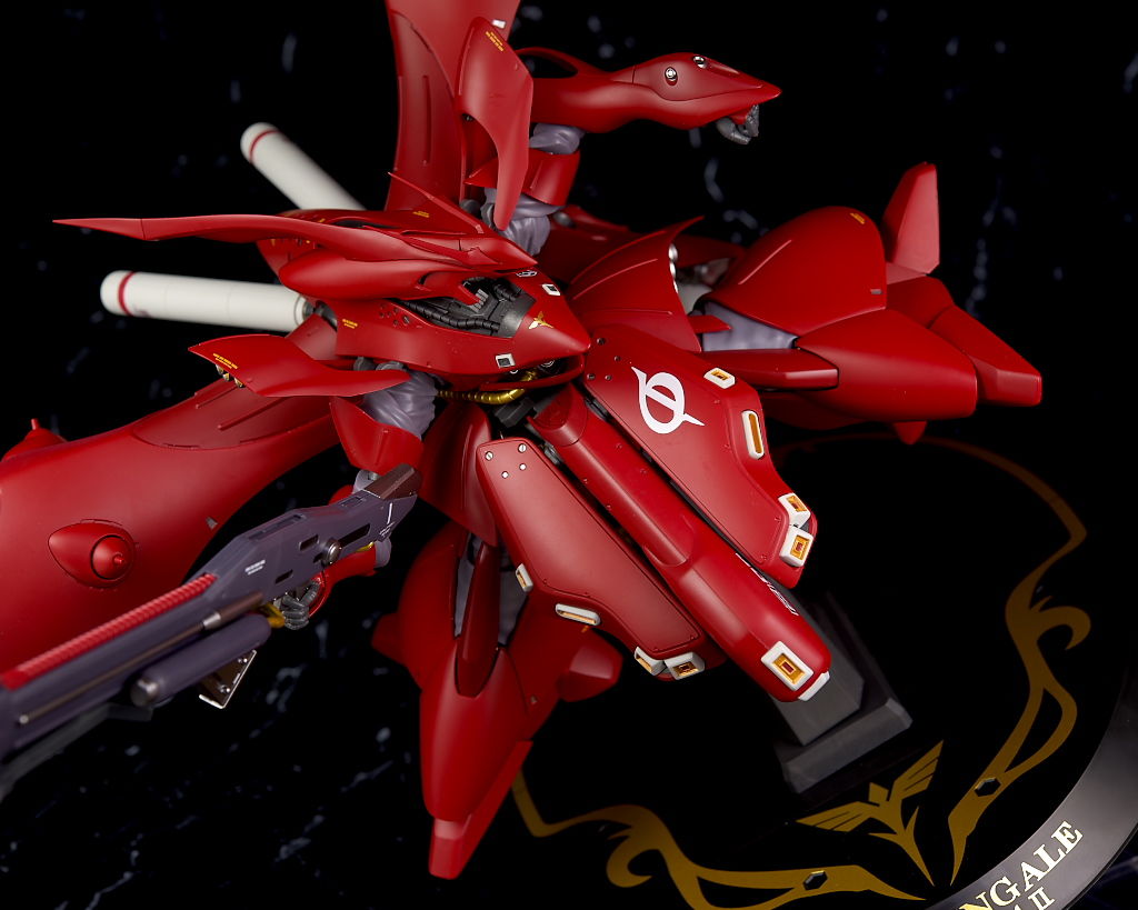 かなり特殊なデザインの機体ですが、設定画を若干アレンジしたようなプロポーションでバランス良くまとまっており、重塗装仕様ということでメインの赤の質感も良好、モールドやマーキングなどで精密感も高められておりかなりの格好良さに仕上がってました。