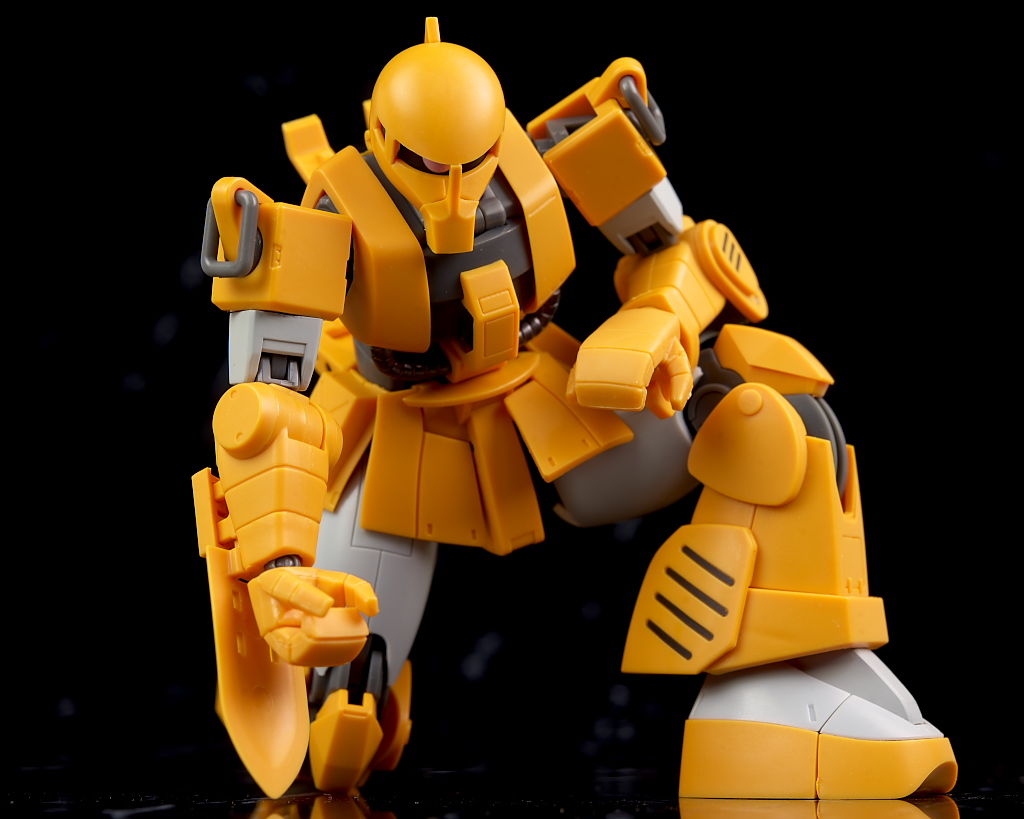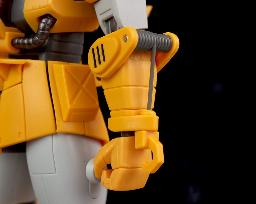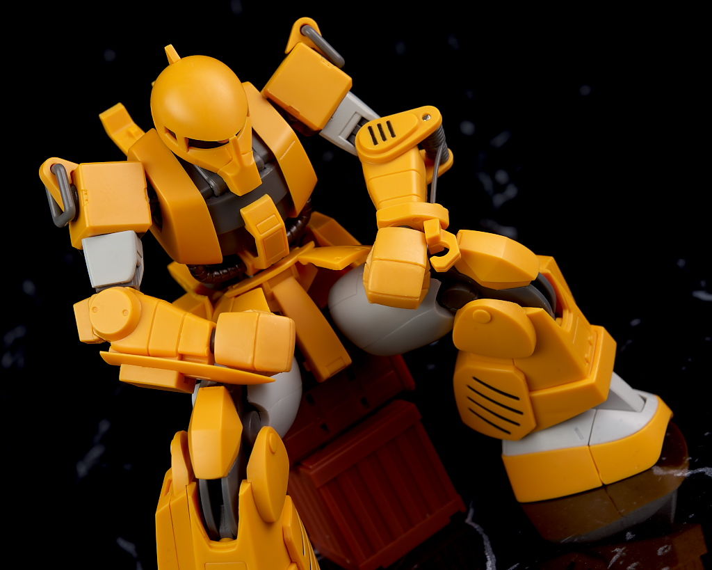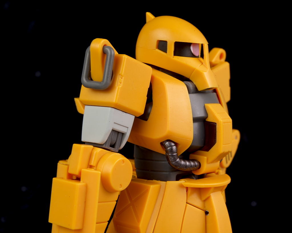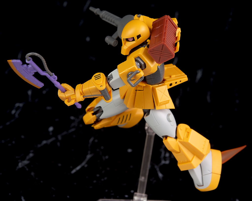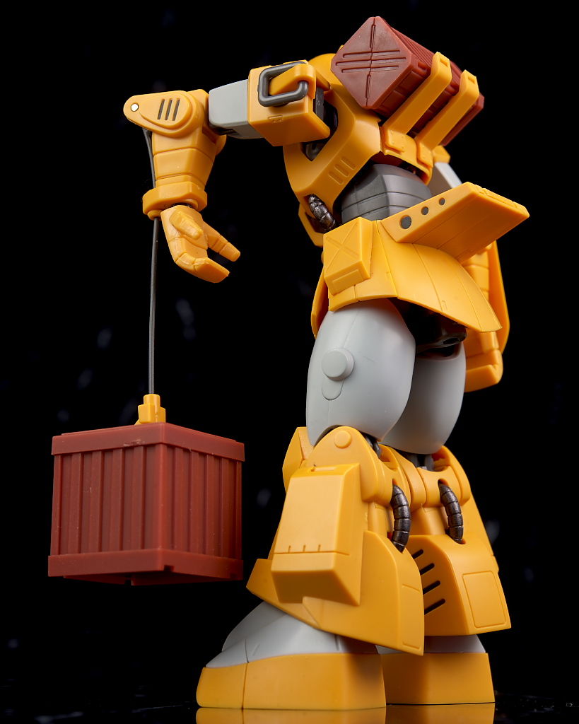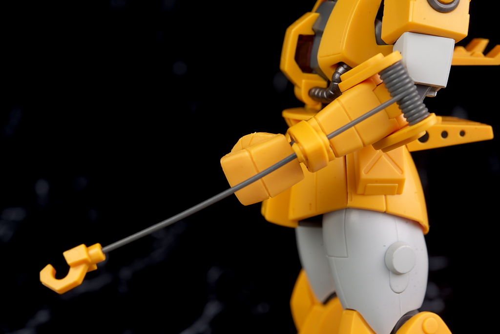 旧ザクをベースに作業を目的として改造されたMSだそうで、武器類は一切なく右腕にはショベル、左腕にはウィンチを装備し、カラーリングも重機のようで独特な趣のある見た目になってました。