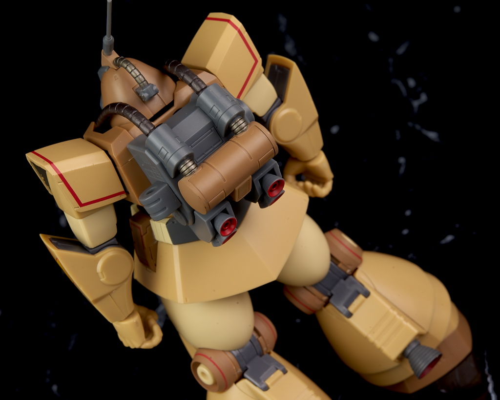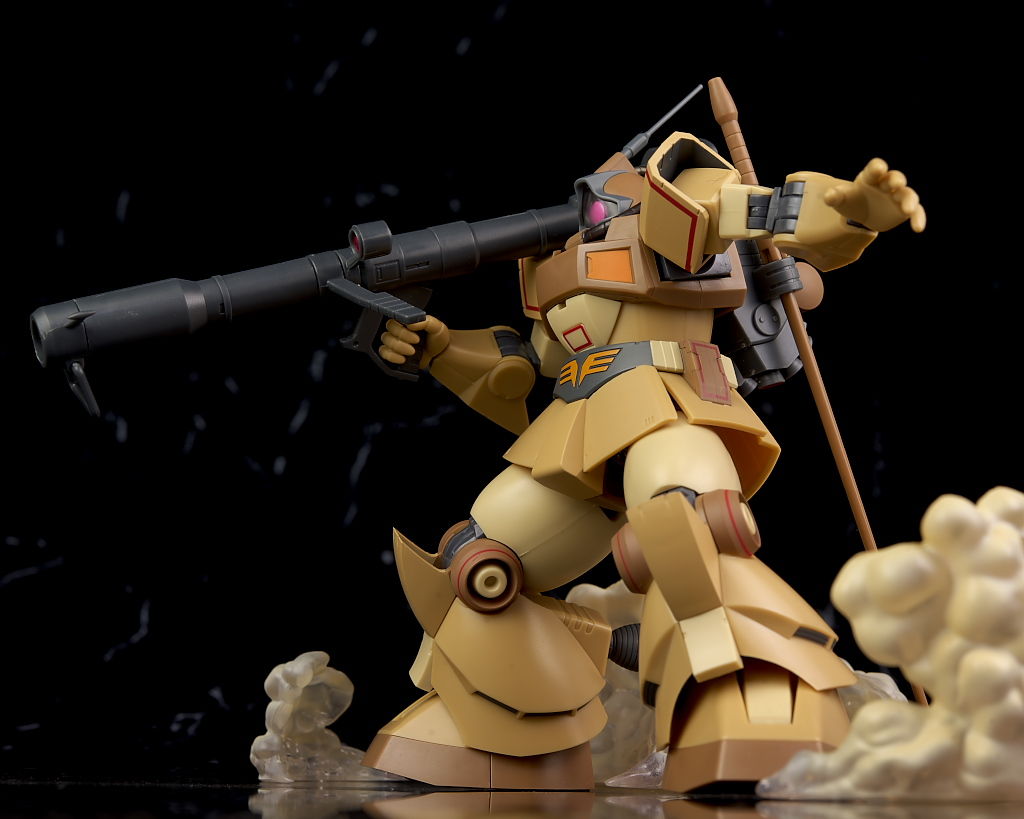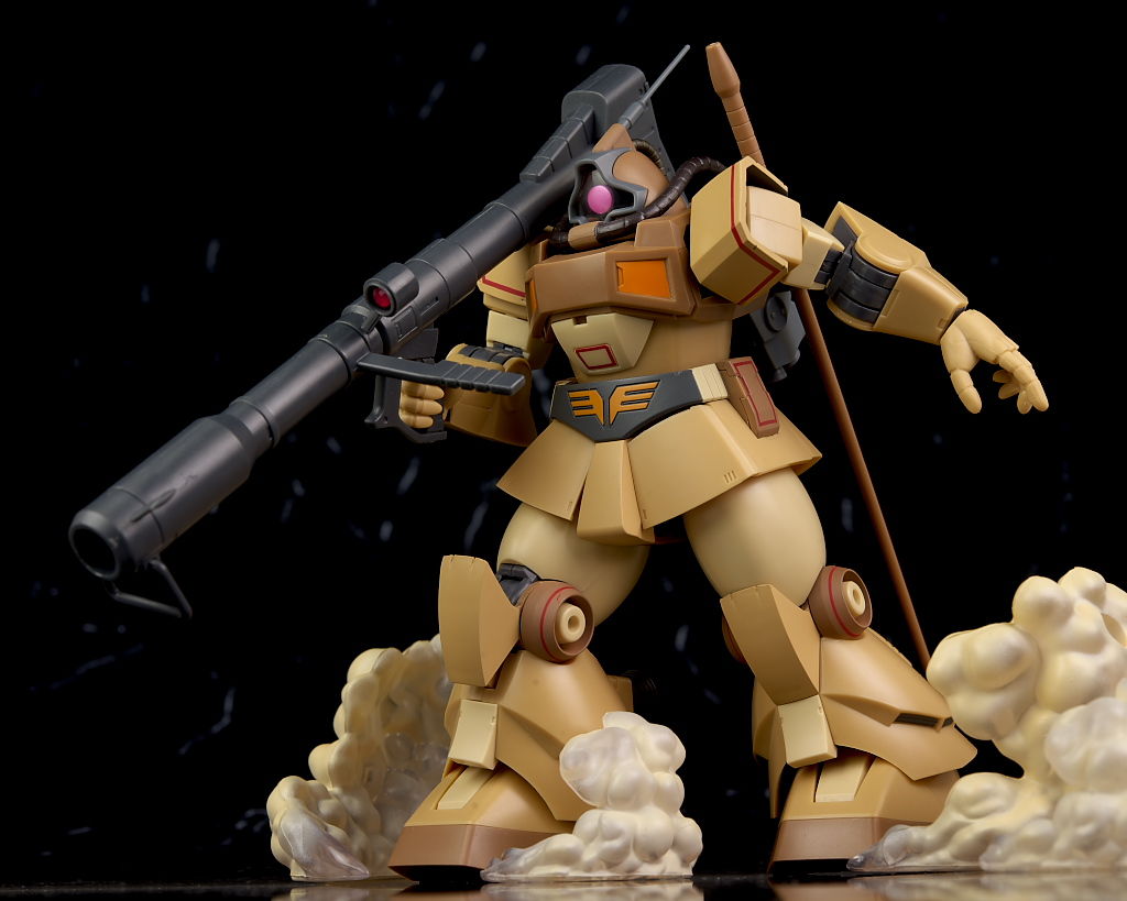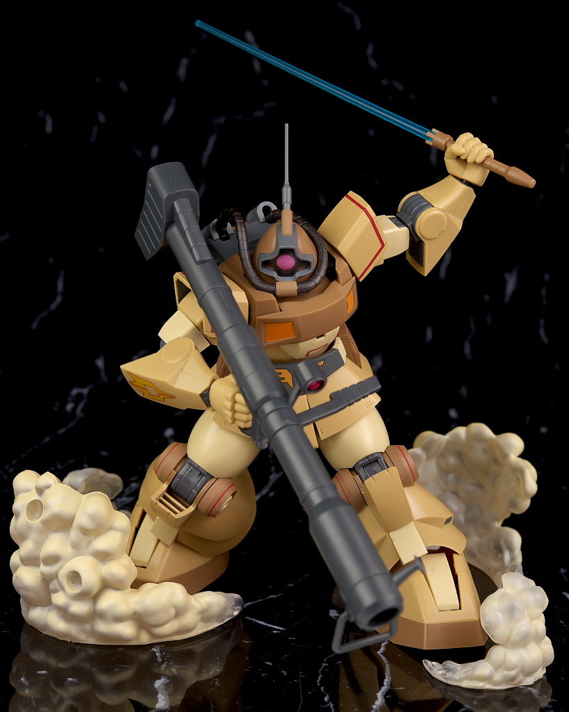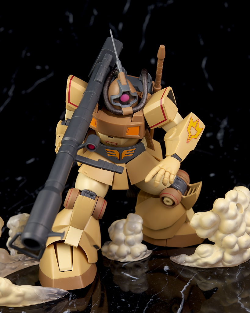 独特な頭部デザインや熱帯・砂漠専用MSらしいサンドカラーが違和感なく再現されており、各部のマーキングなども精密、エフェクトも流用ですが色など上手く砂塵っぽくなっており、満足度の高い内容になってました。