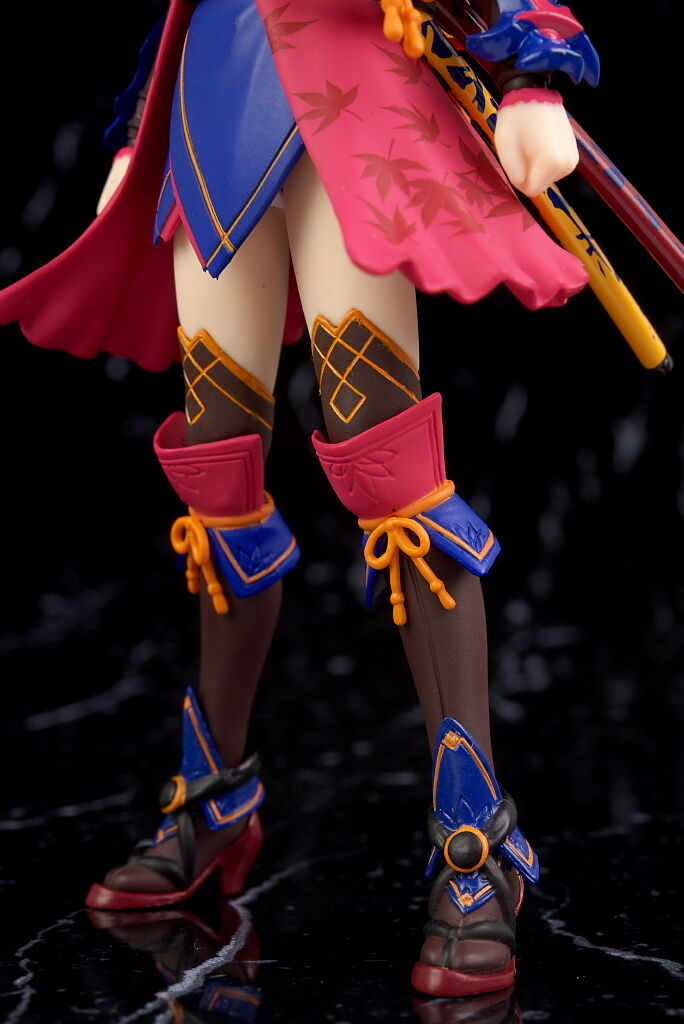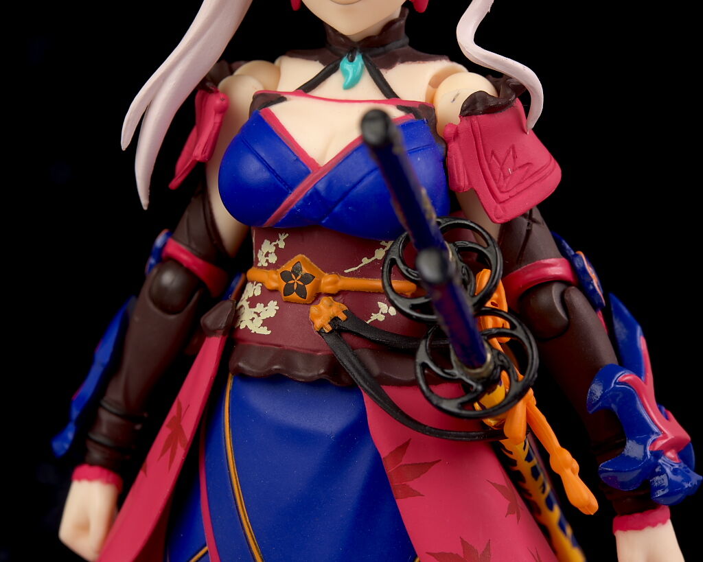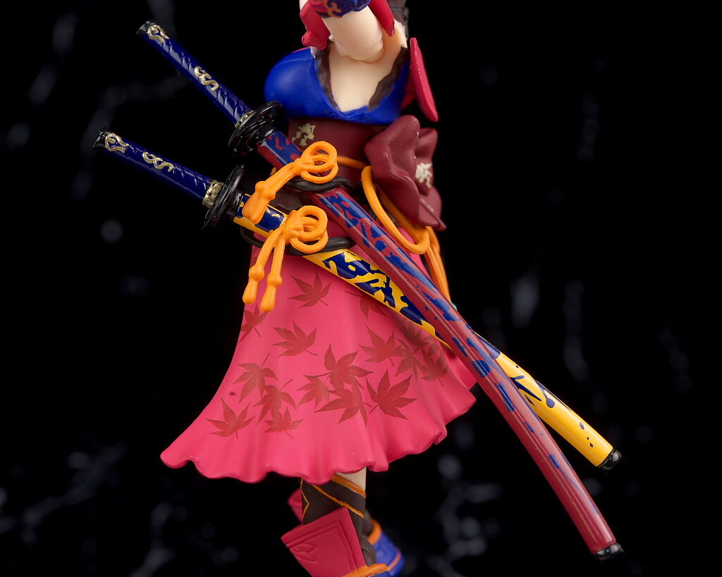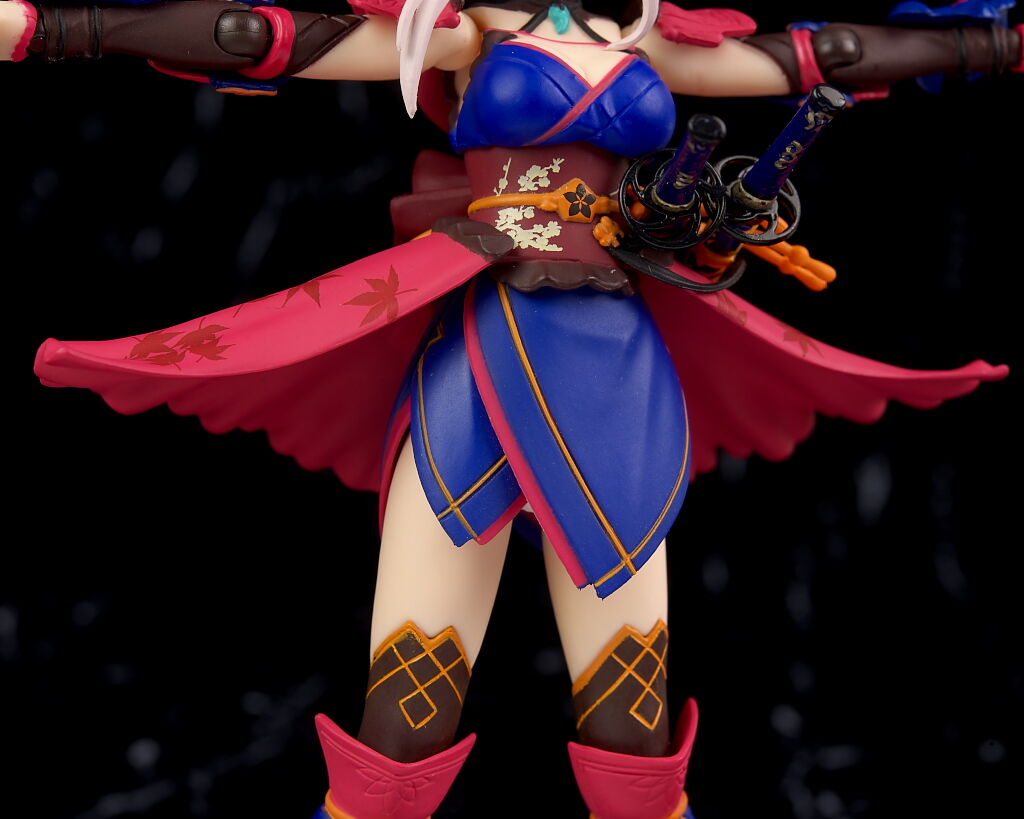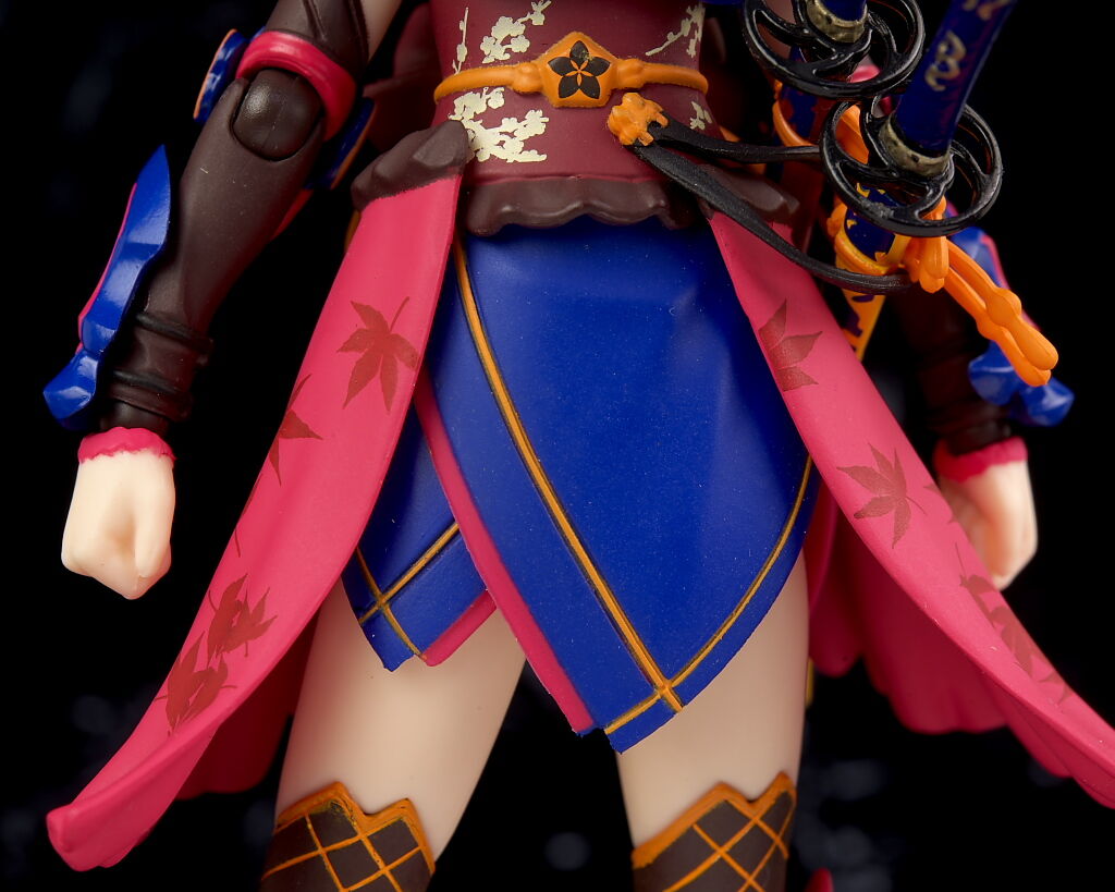 左腰には2本の刀。それぞれ軟質素材の紐で繋がってるので位置調整が可能。裾の紅葉模様も綺麗に再現。