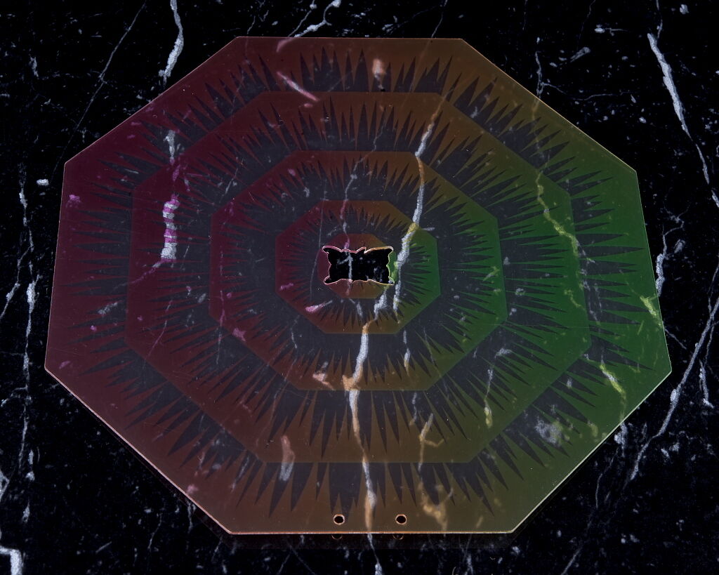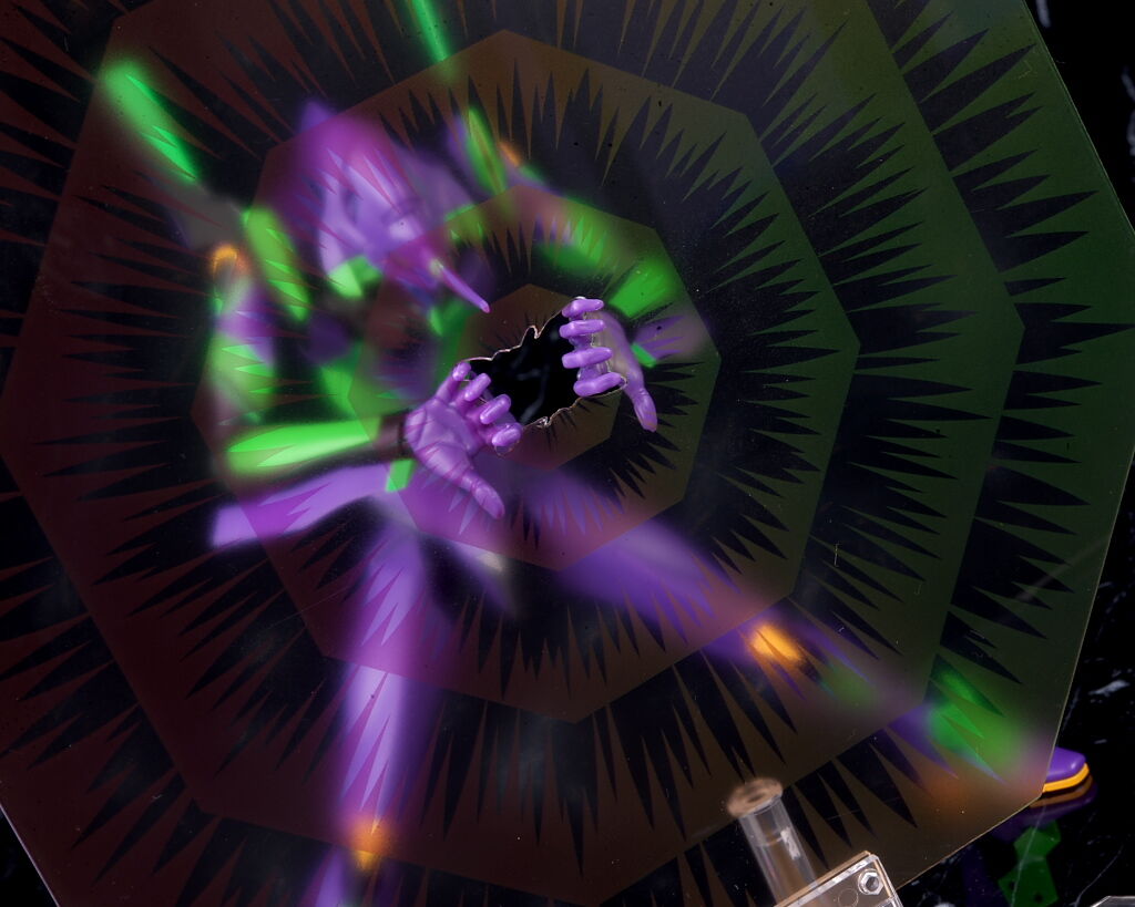 A.T.フィールド。こちらは台座で固定して使用。若干の高さ調節が可能。旧版では赤でしたが今回は紫と緑のグラデに。