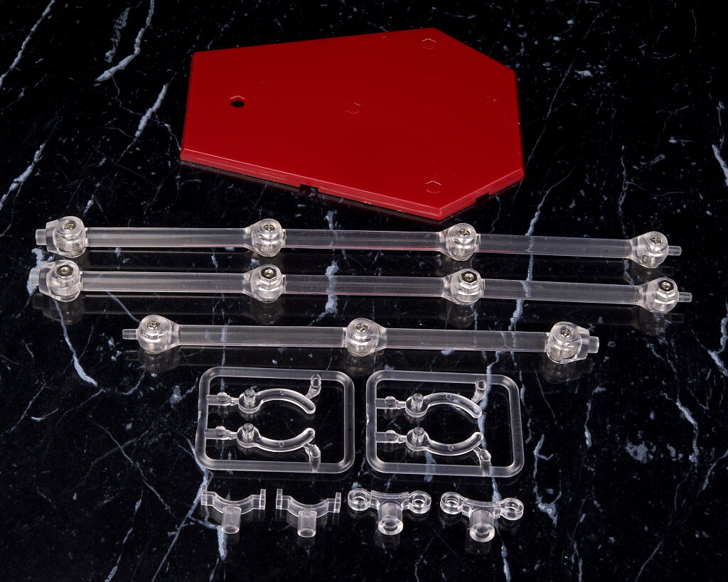 スタンド類一式。本体を浮かせる支柱の他、腕を支える補助支柱とクリップも付属。