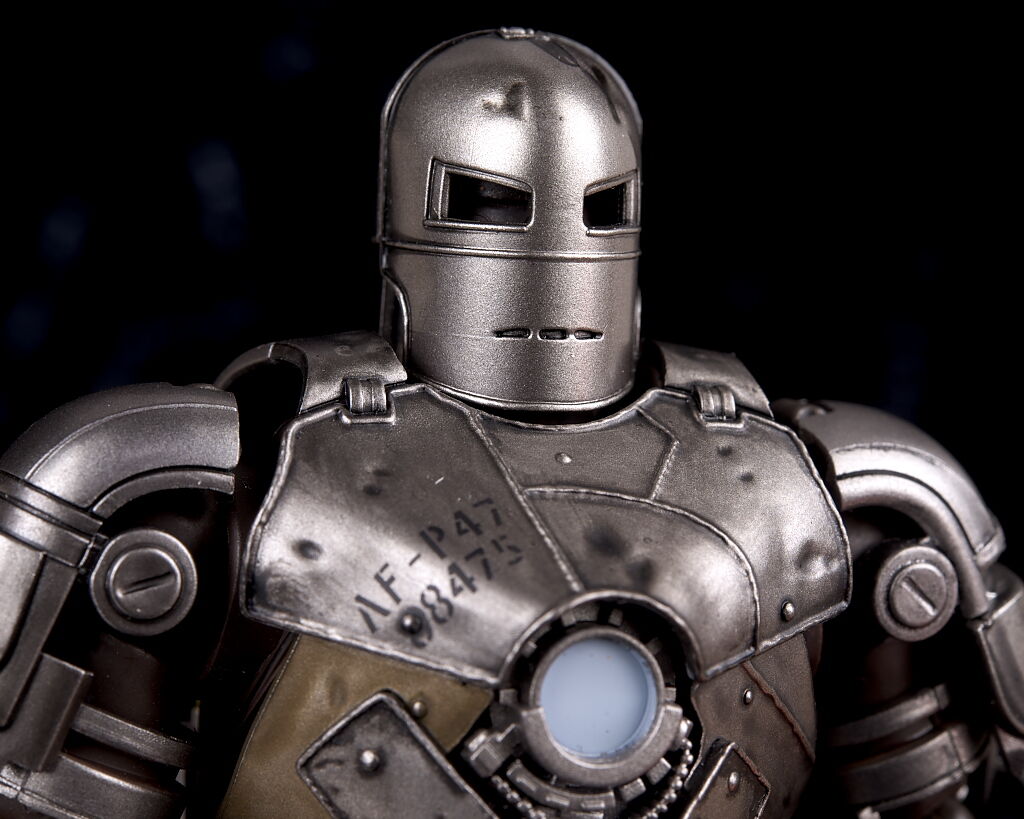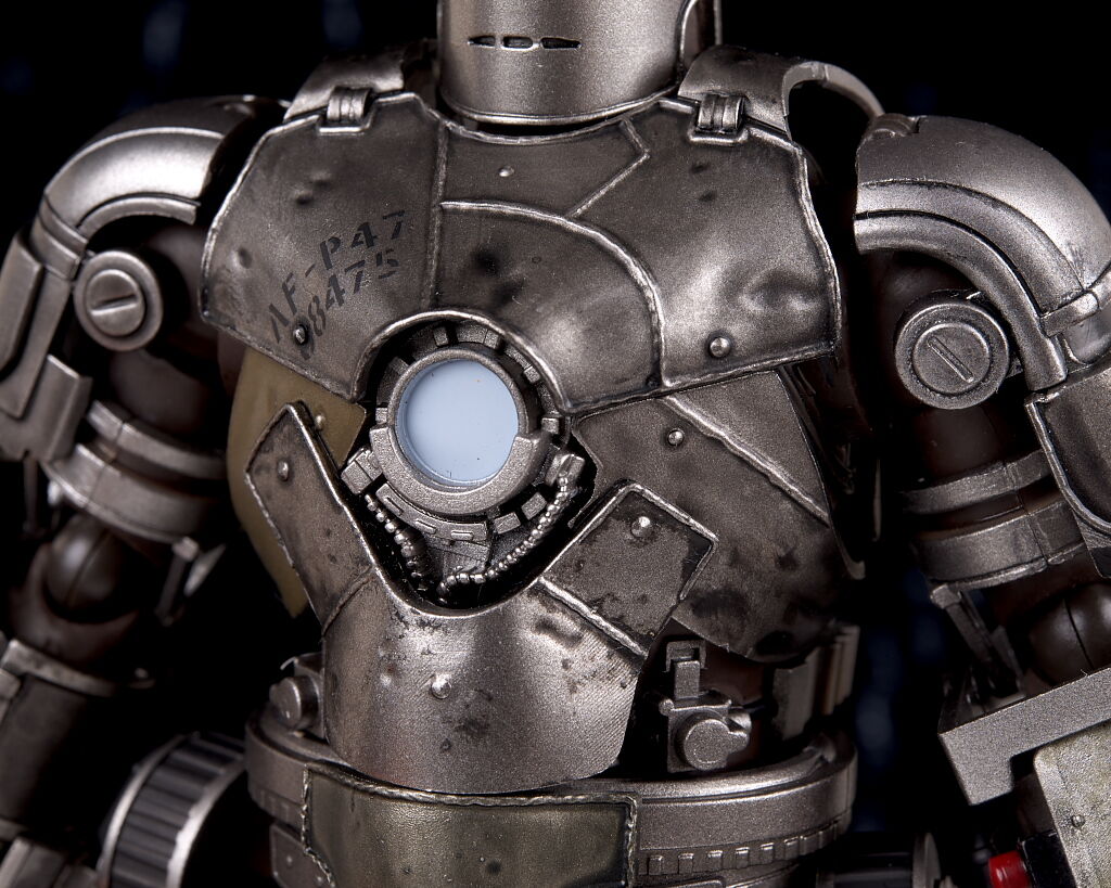 顔。他のアイアンマンとは全く異なる作業用のフェイスシールドみたいなデザイン。適度に傷みも再現されリアルな見た目に。
