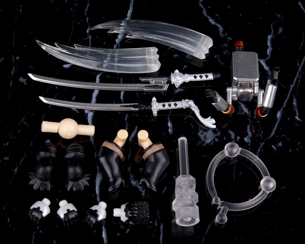体の作りは腕はいつも通り軸接続ですが、股関節はボールジョイント形式でした。腕足共に交換パーツが付属。