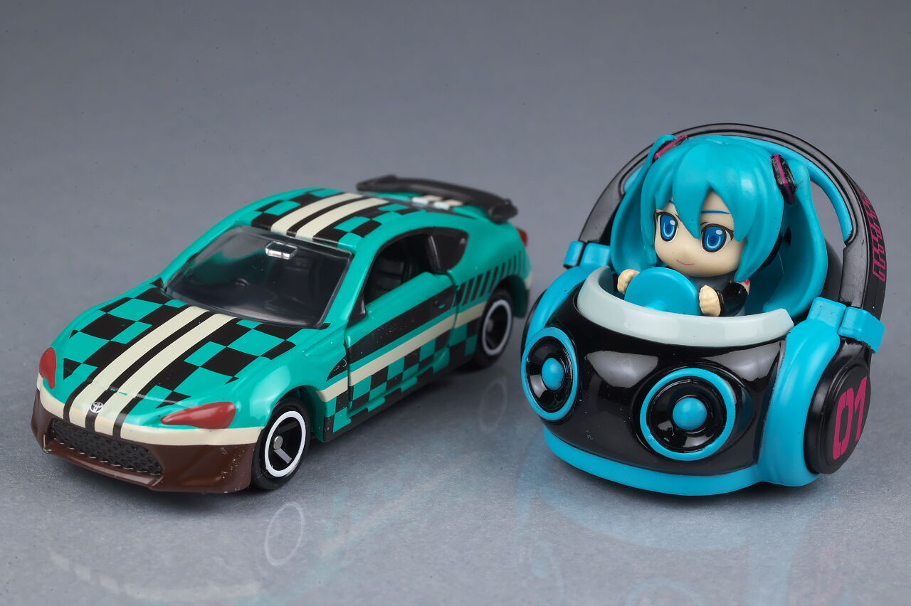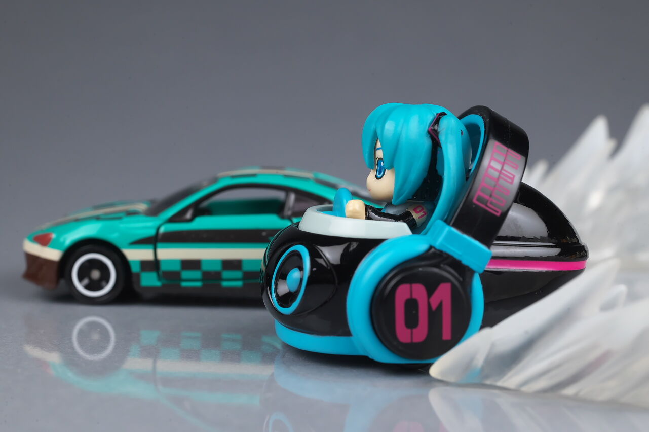 全体。変わり種ばかりのドリームトミカシリーズに初音ミクがラインナップ。本人が乗ってるという独特な作りが特徴。