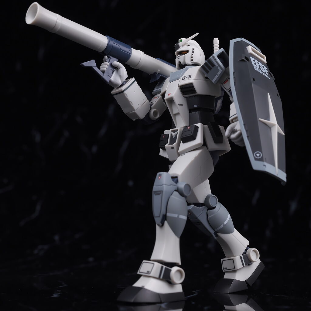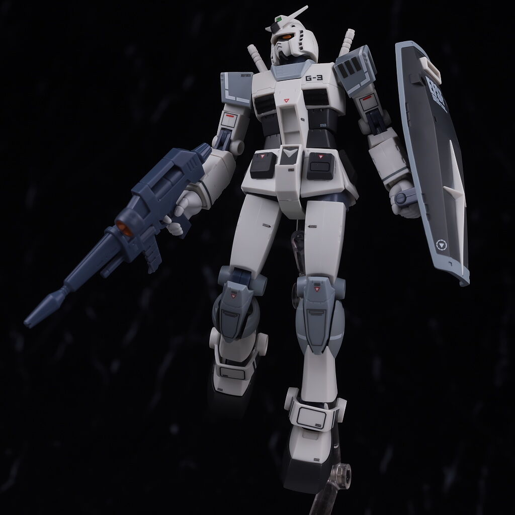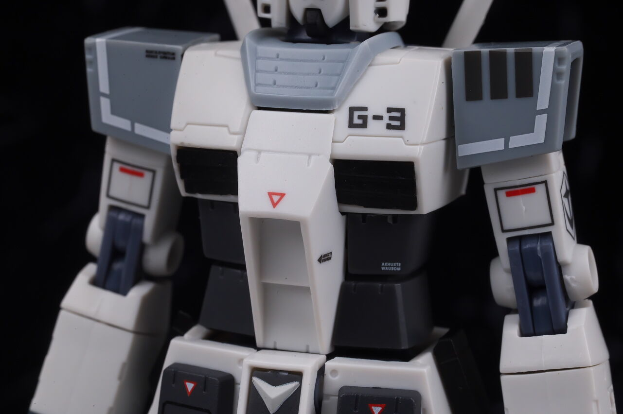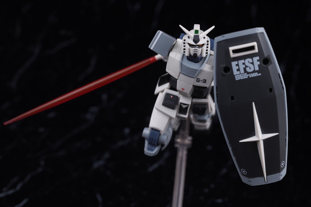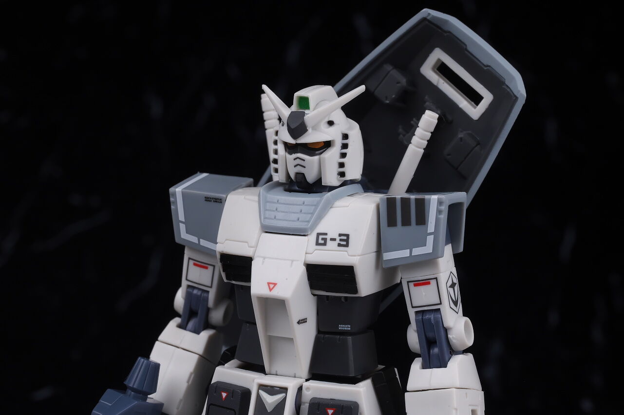 G-3ガンダムと言えば全身暗めのグレーと言うイメージでしたが、今回は薄い部分は更に薄く、濃い部分は更に濃くなっており、モノクロ感が引き立つ独特なカラーリングになってました。