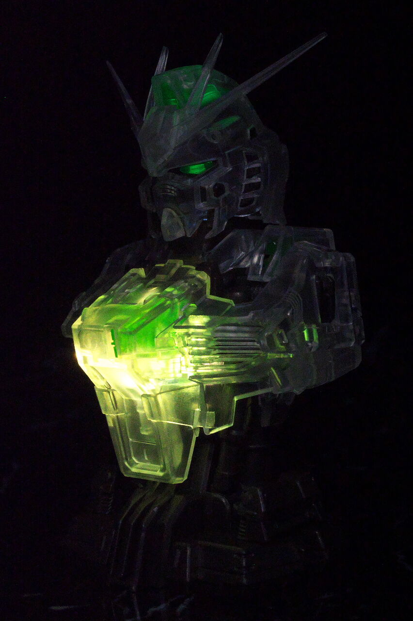 胸は派手に光りますが、頭部の方は構造上少し光が弱かったです。また胸部左上のセンサーは光らない仕様。