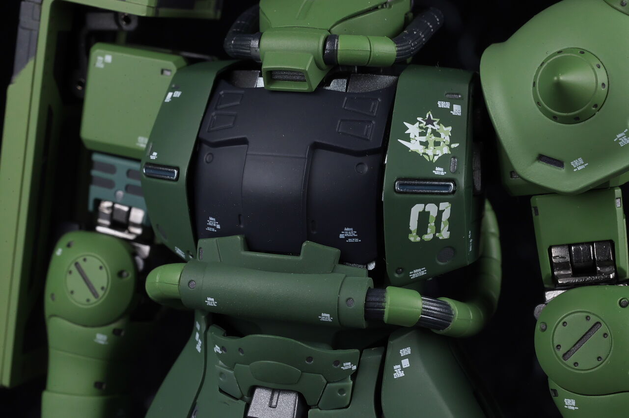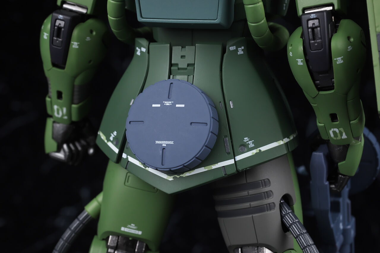 腕は左右非対称。肩アーマーのスパイクはノーマルザクより短めに。左前腕は装甲が外れた状態に。