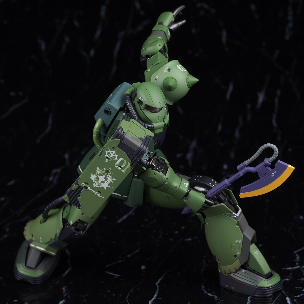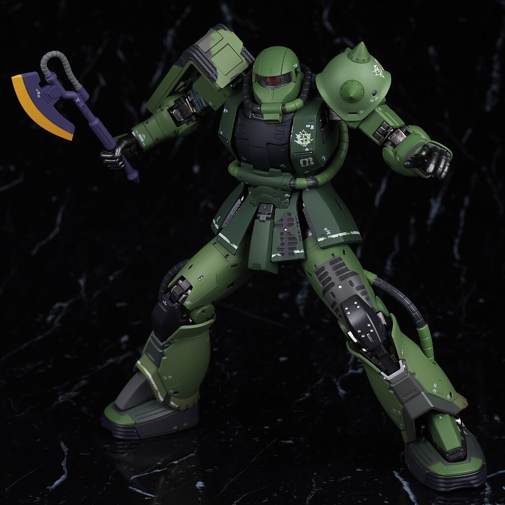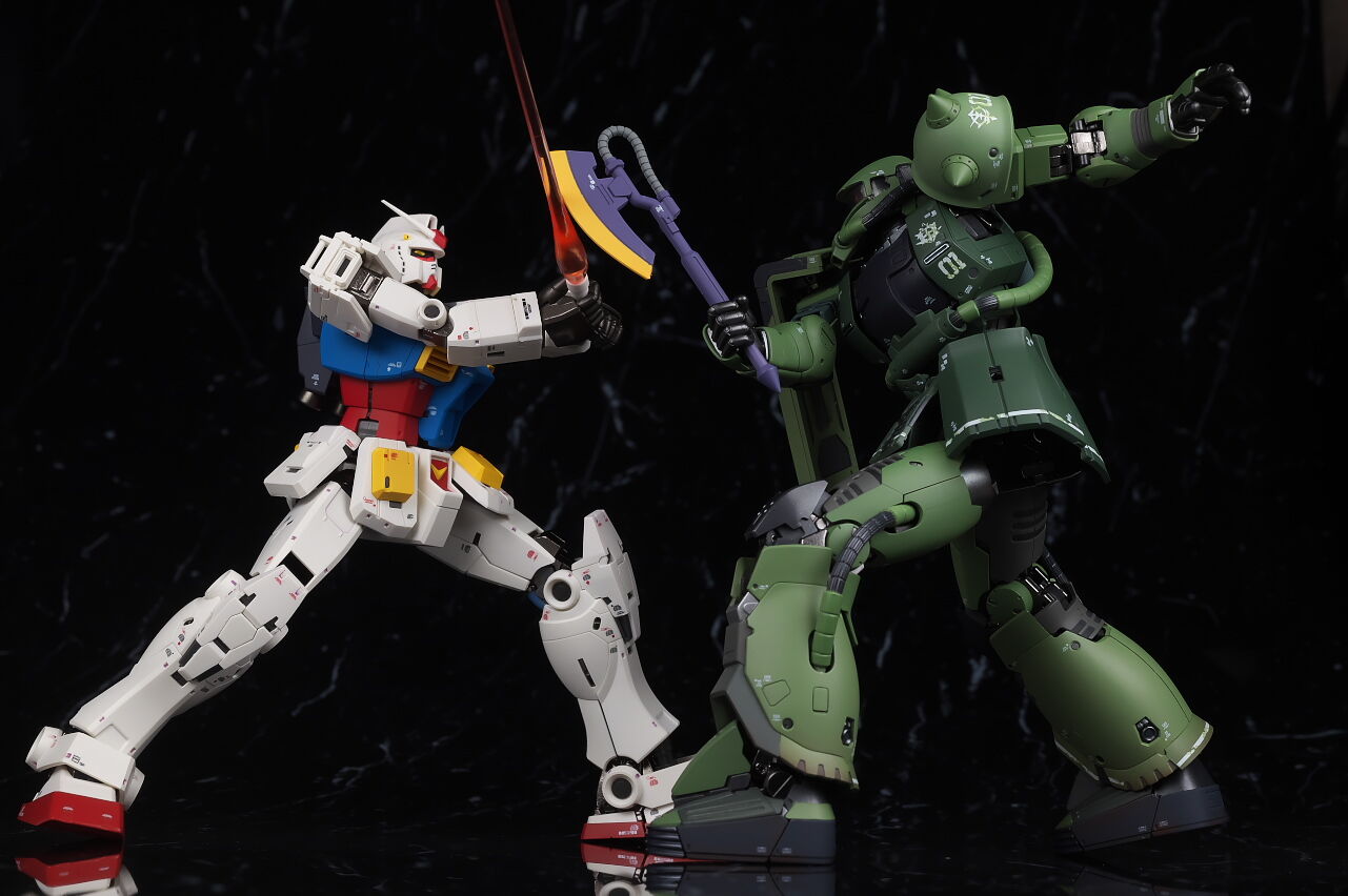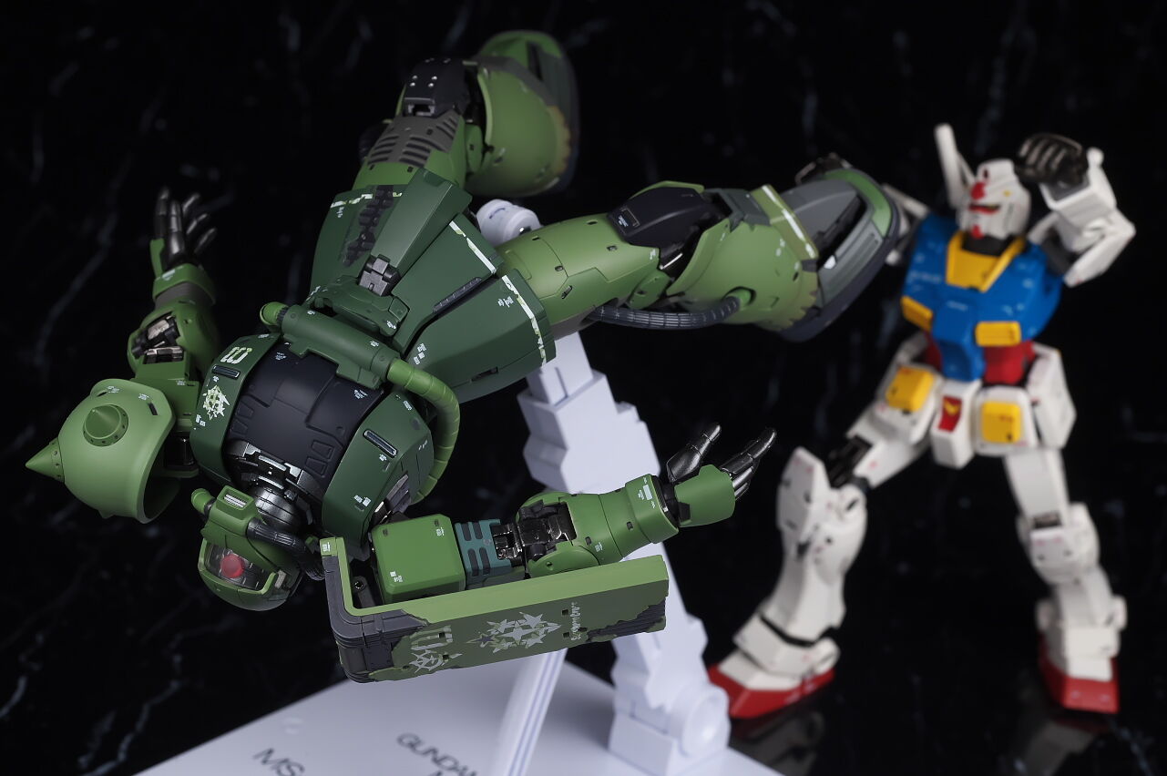 ガンダムは大部分が流用でしたが、今回のザクは大半が新規造形で劇中の損傷個所やマーキングなども精密に再現されており、四肢が若干細かったり、モノアイのサイズを選べるなどかなりのこだわりっぷりで、新鮮味のある内容になってました。